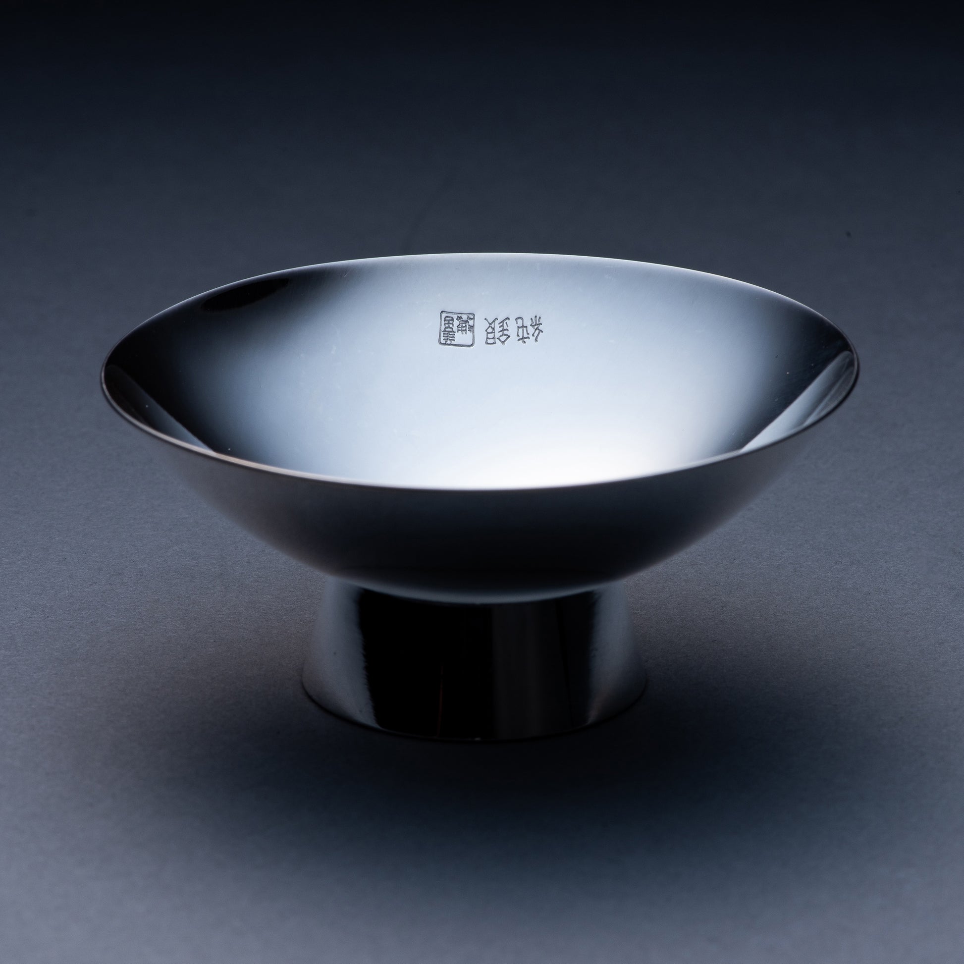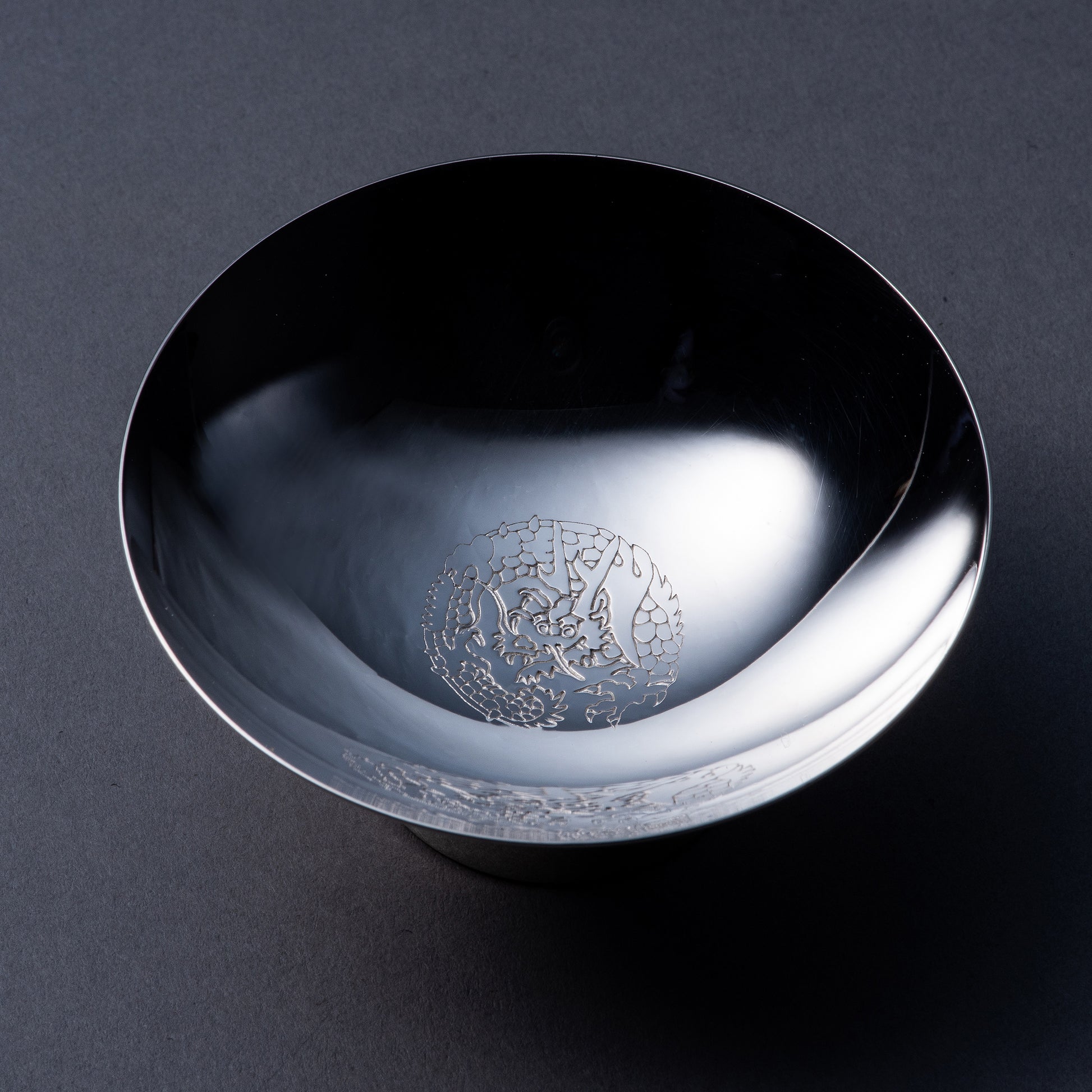お酒を注ぐと盃の底に球体が浮かび上がる「玉盃」です。浮かび上がる球体を「宝玉」に見立て、龍が宝玉をつかむ図柄です。