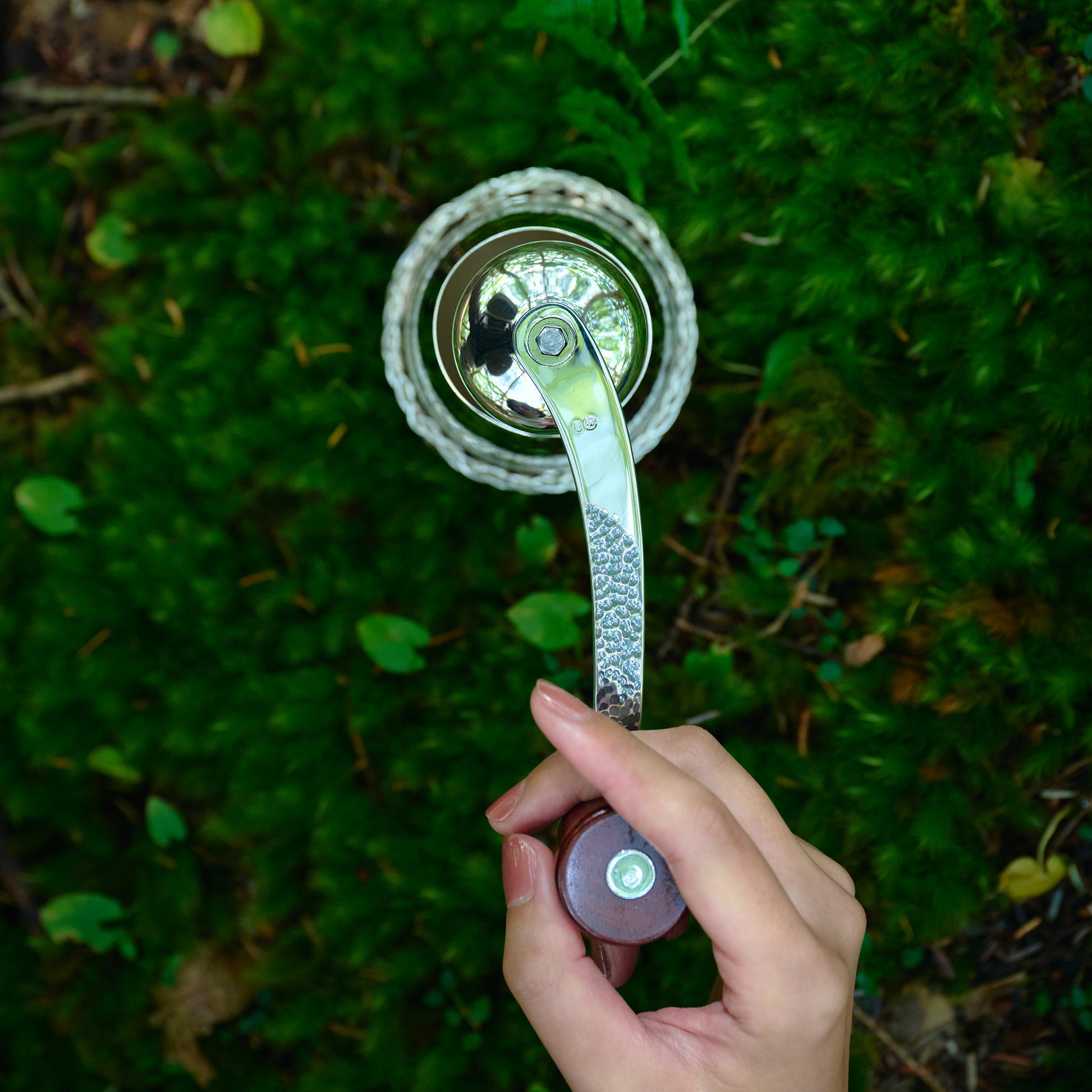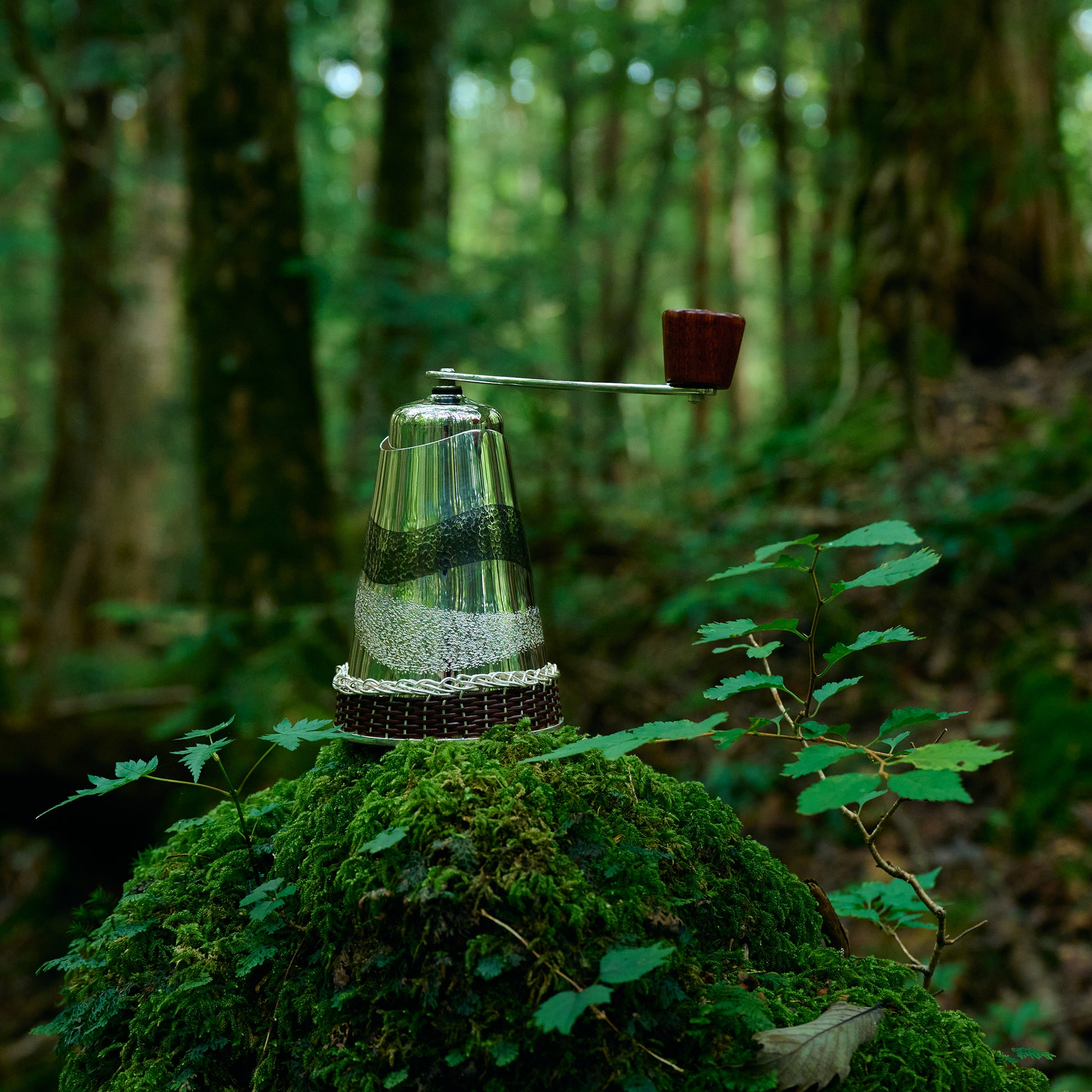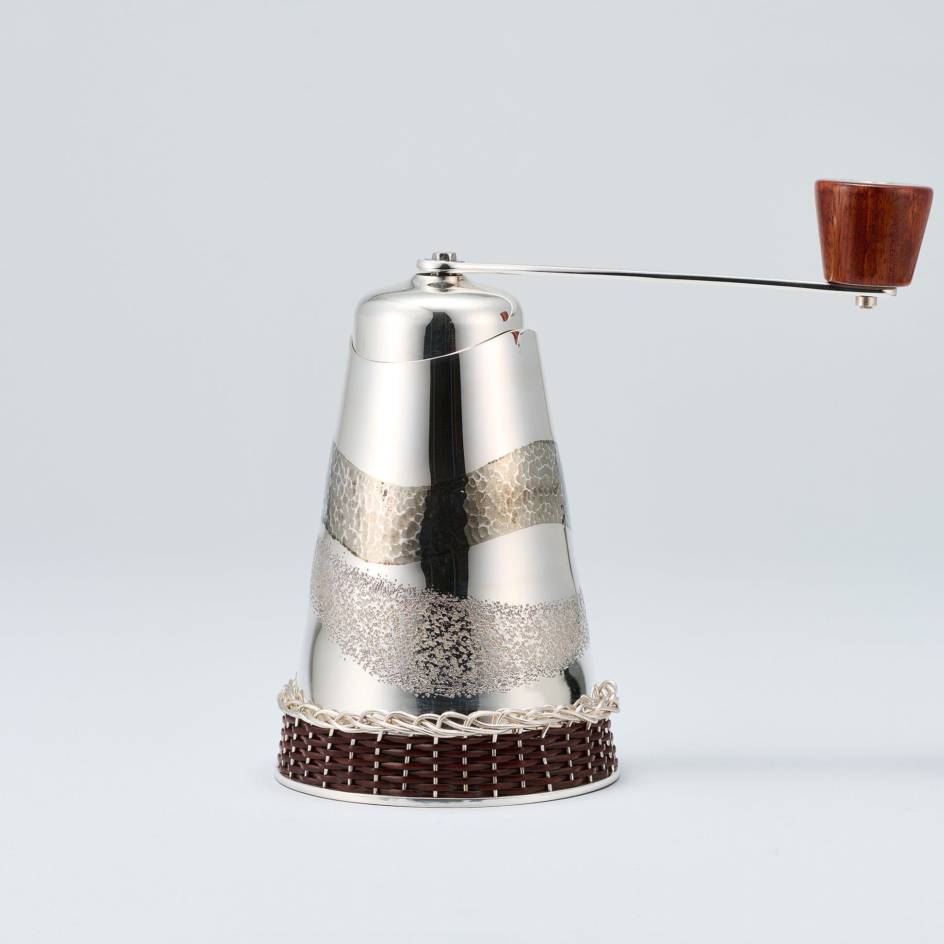 銀製のコーヒーミルとミルのケースのセットです。ケースの底部の籐巻きも東京の伝統工芸です。