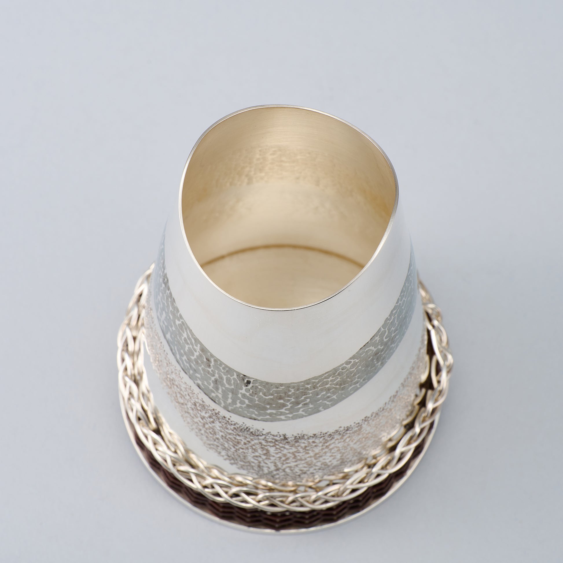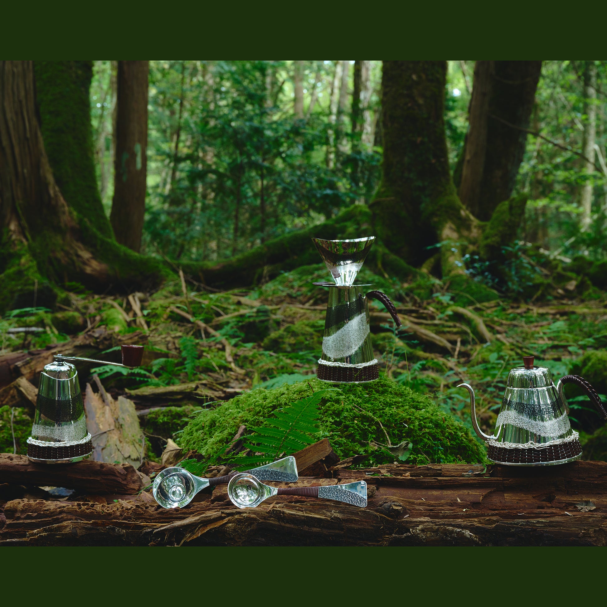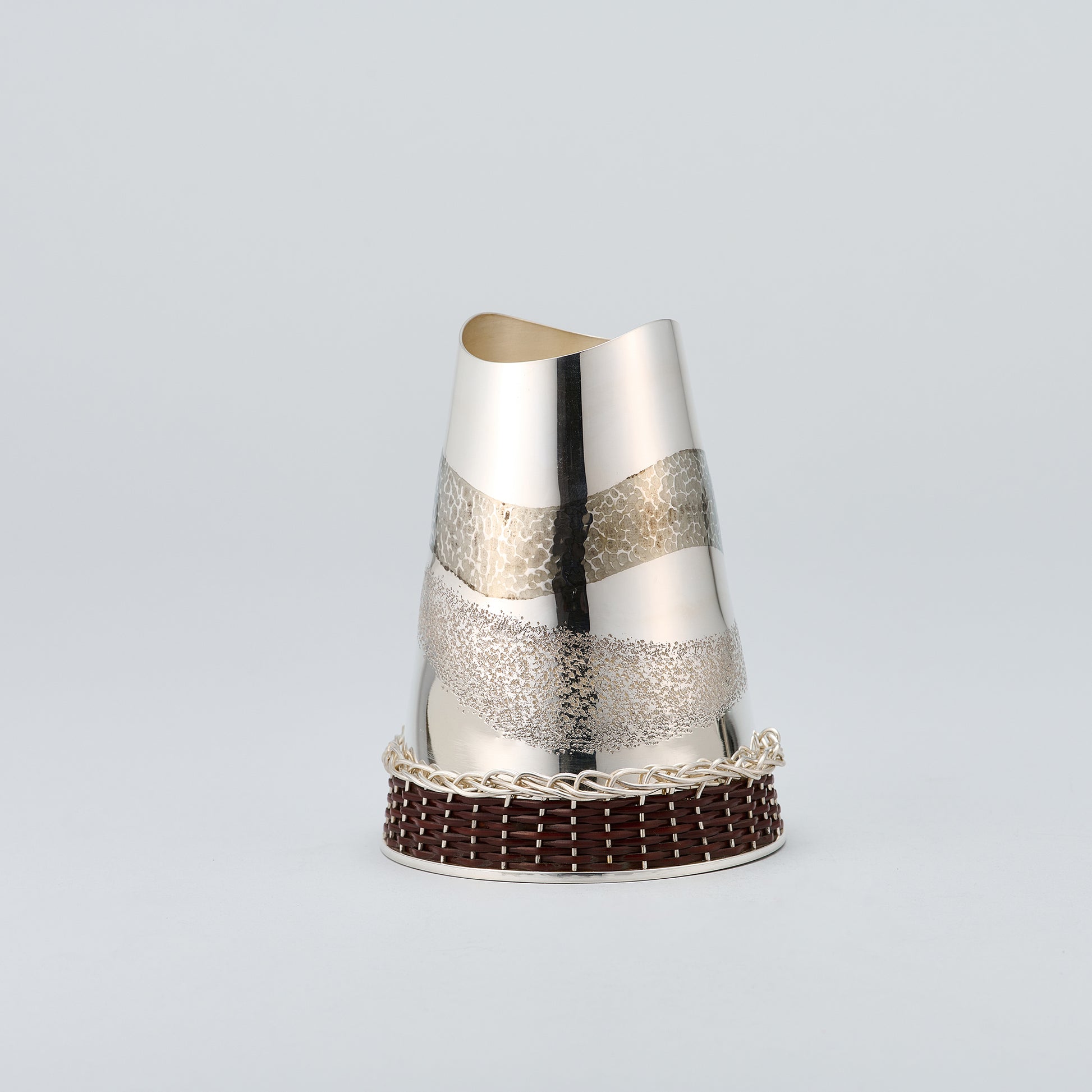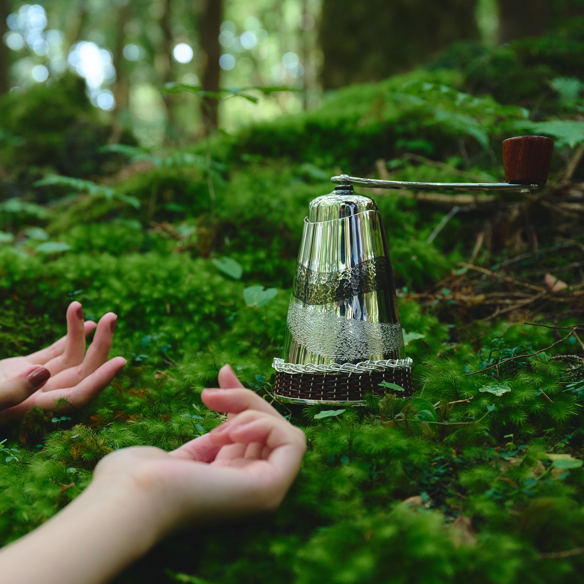 銀製のコーヒーミルとミルのケースのセットです。ケースの底部の籐巻きも東京の伝統工芸です。