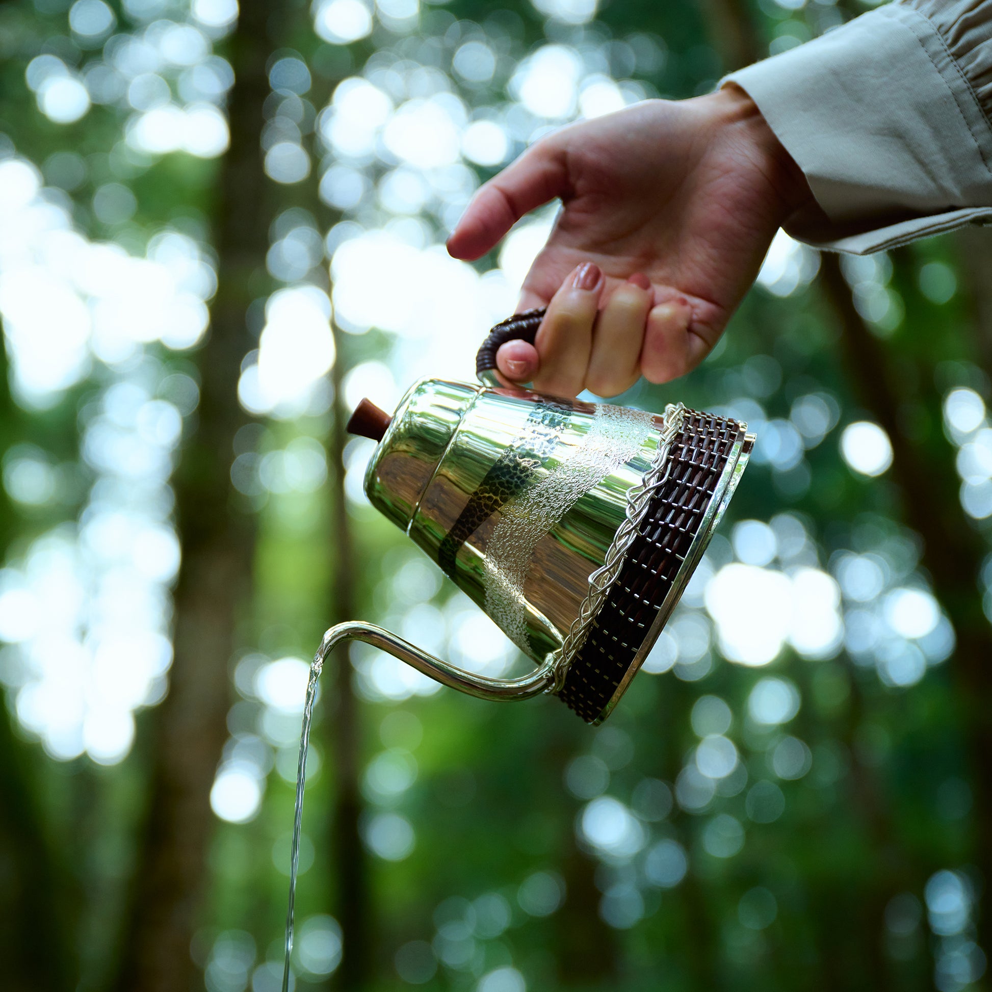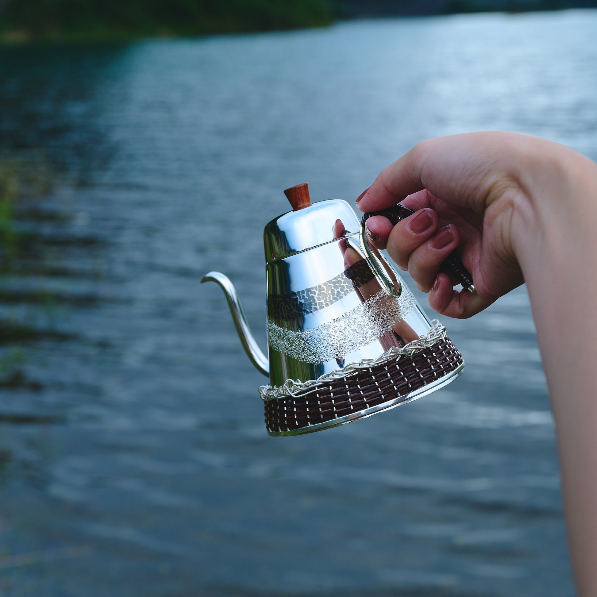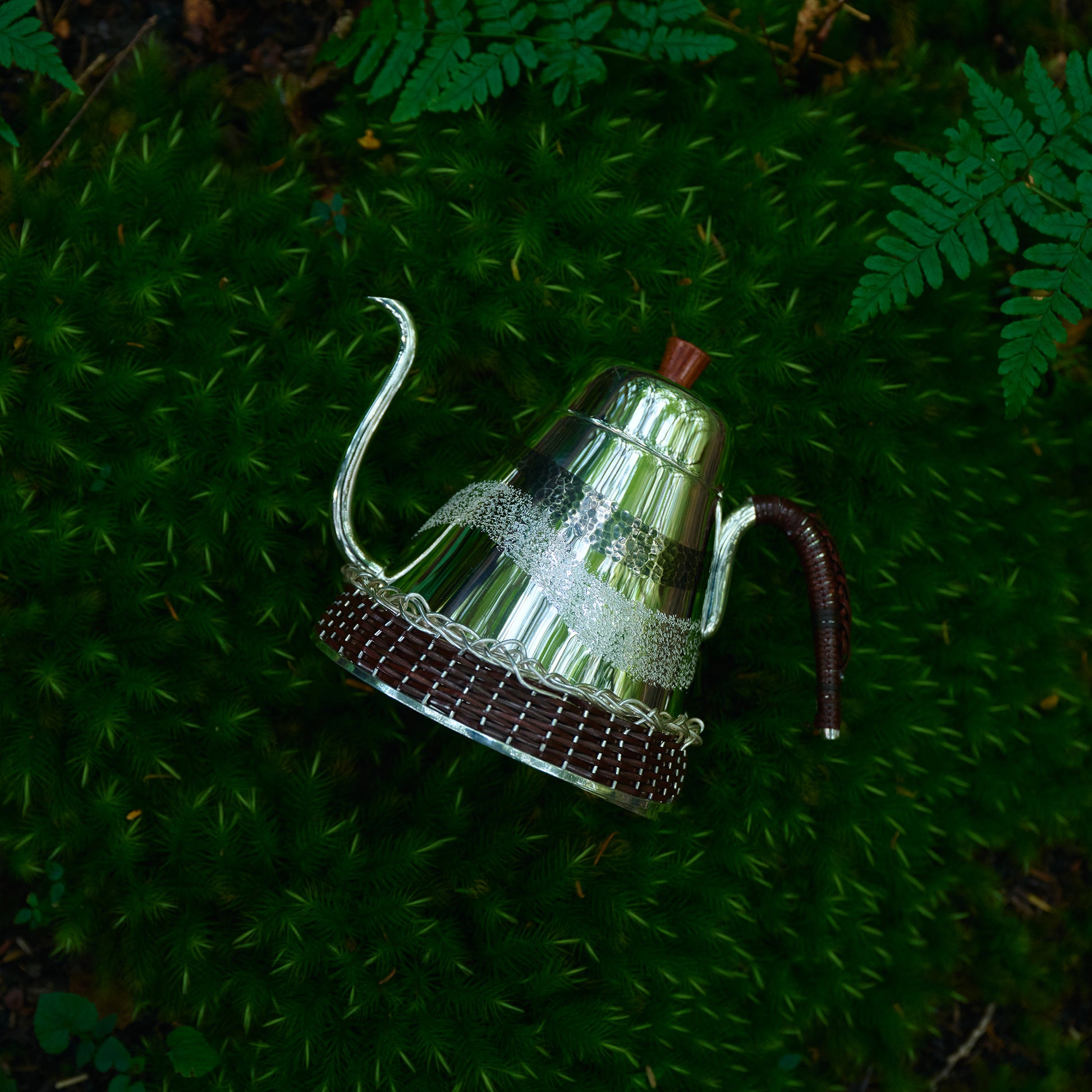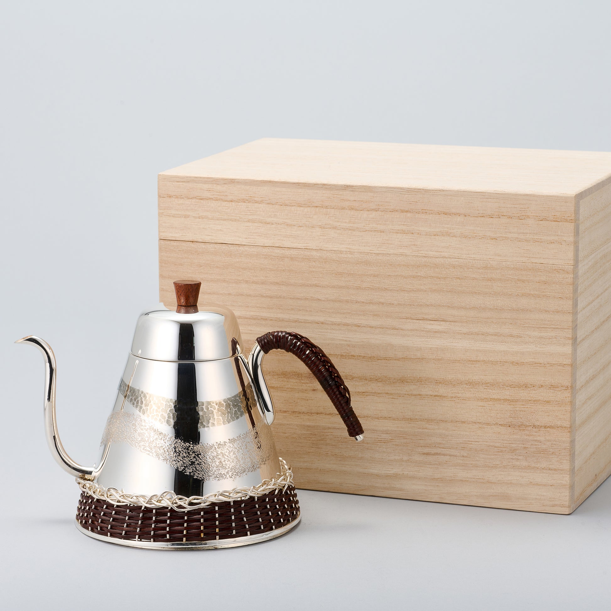 銀製のコーヒーポットです。直接火にかけることはできません。沸かしたお湯を入れて下さい。底部とハンドルの籐巻きも東京の伝統工芸です。