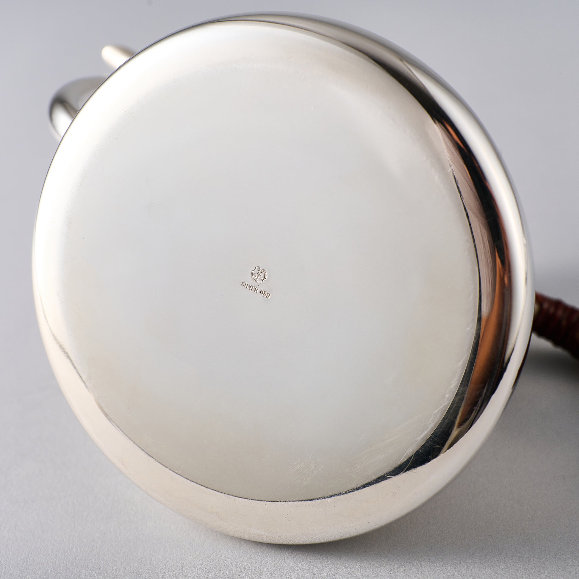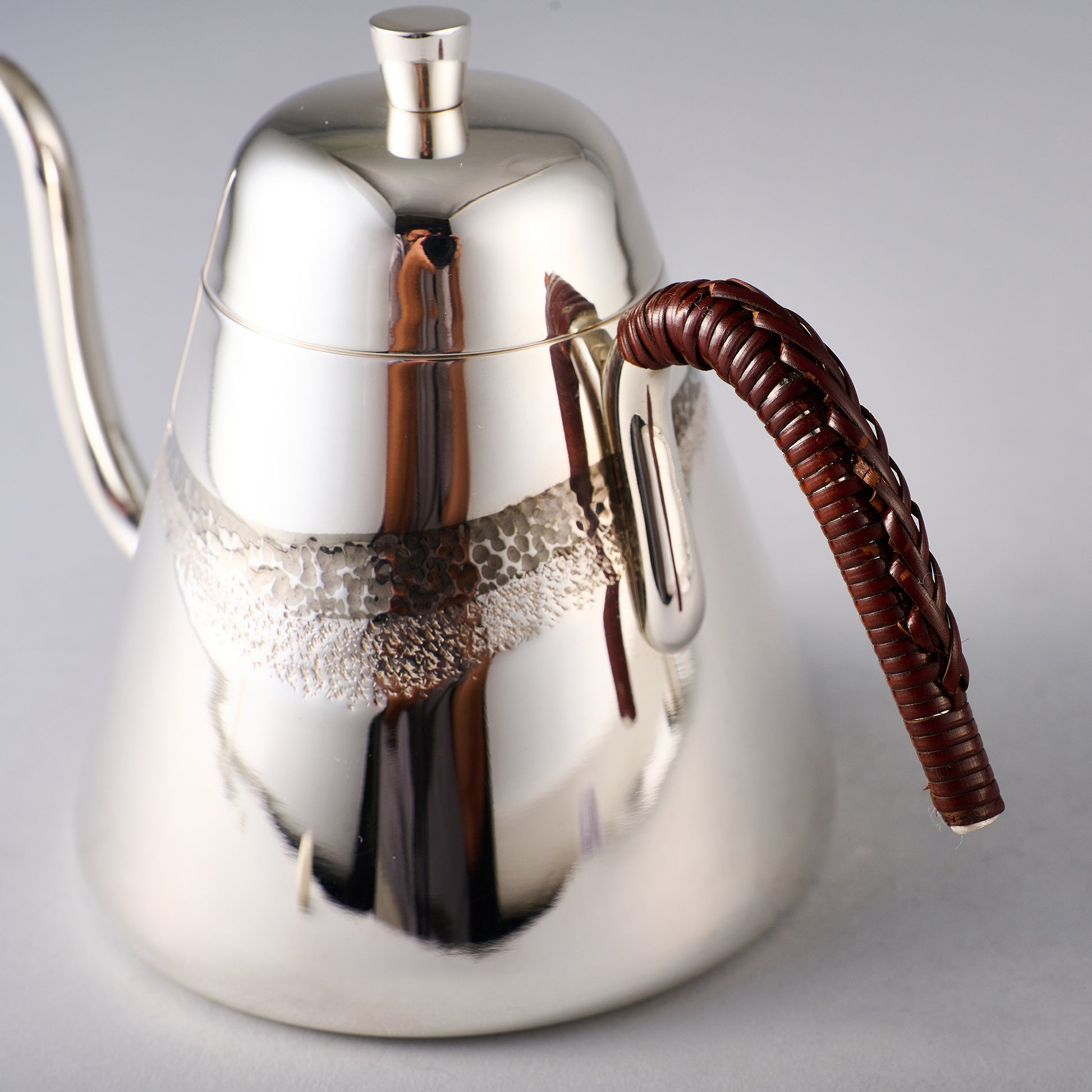 銀製のコーヒーポットです。直接火にかけることはできません。沸かしたお湯を入れて下さい。ハンドルの籐巻きも東京の伝統工芸です。底部の籐巻きの無いシンプルなタイプです。