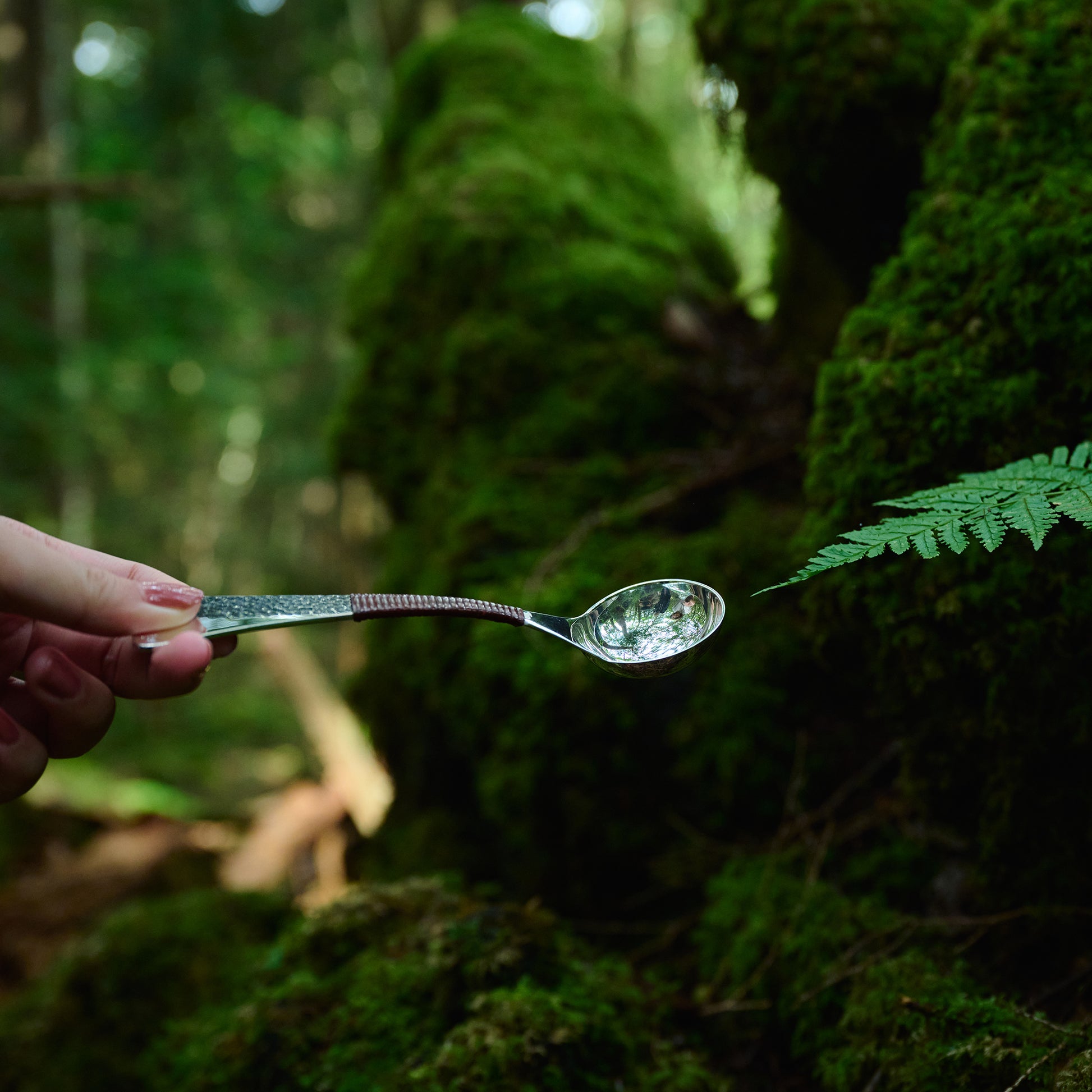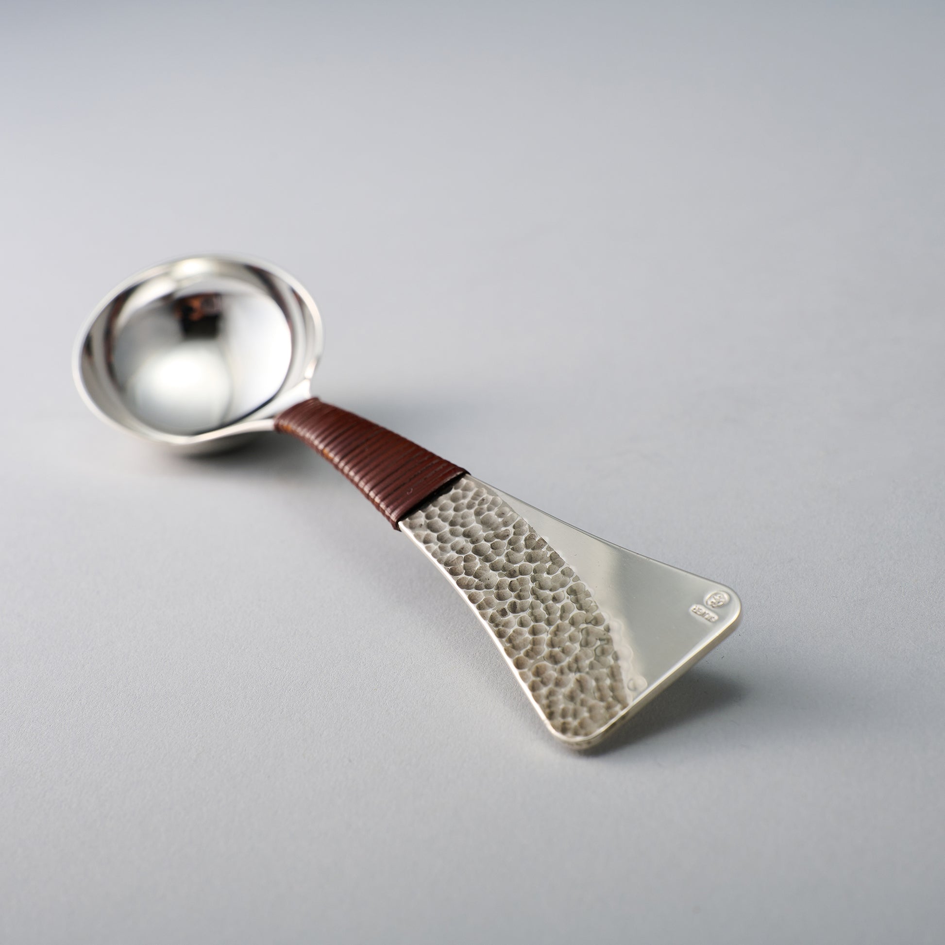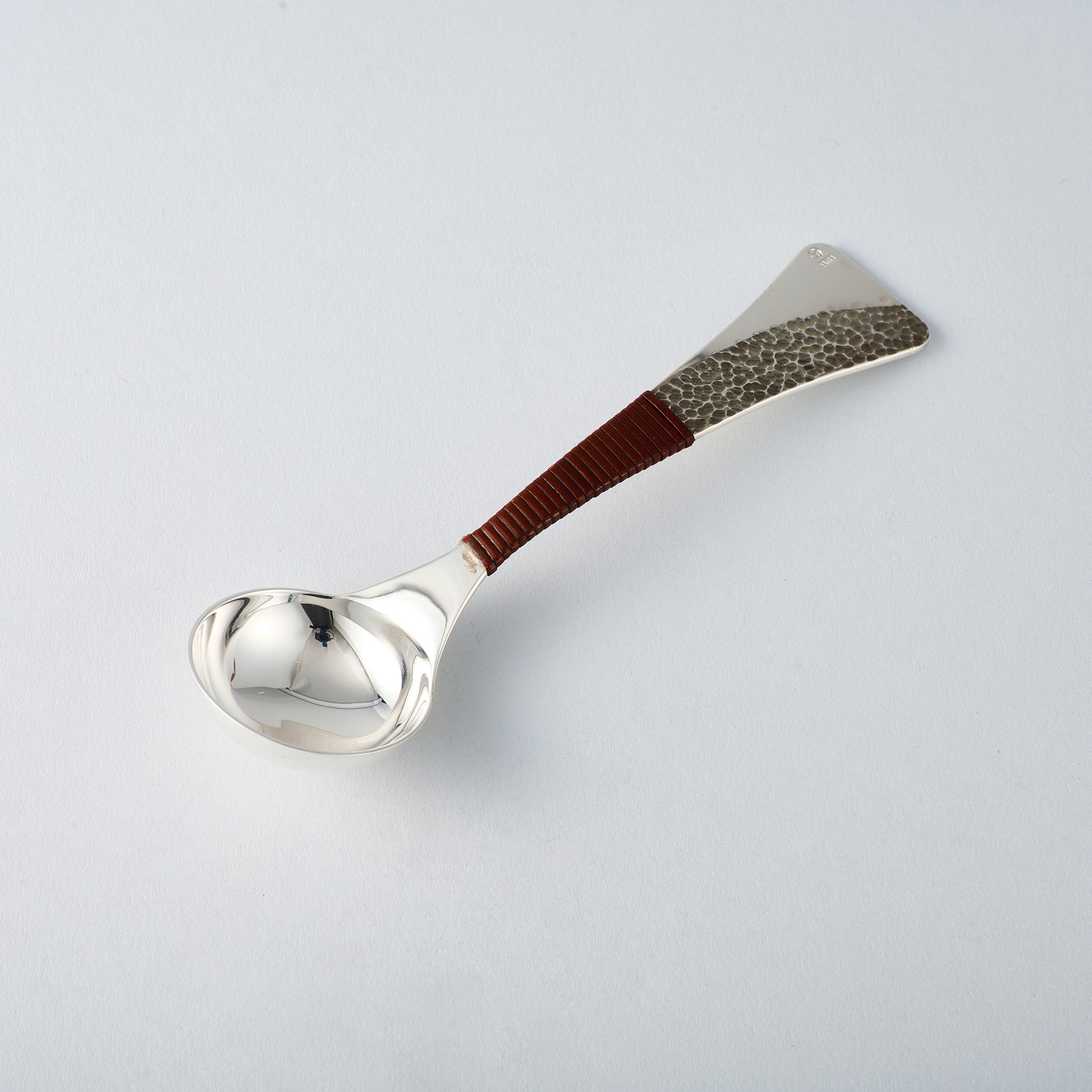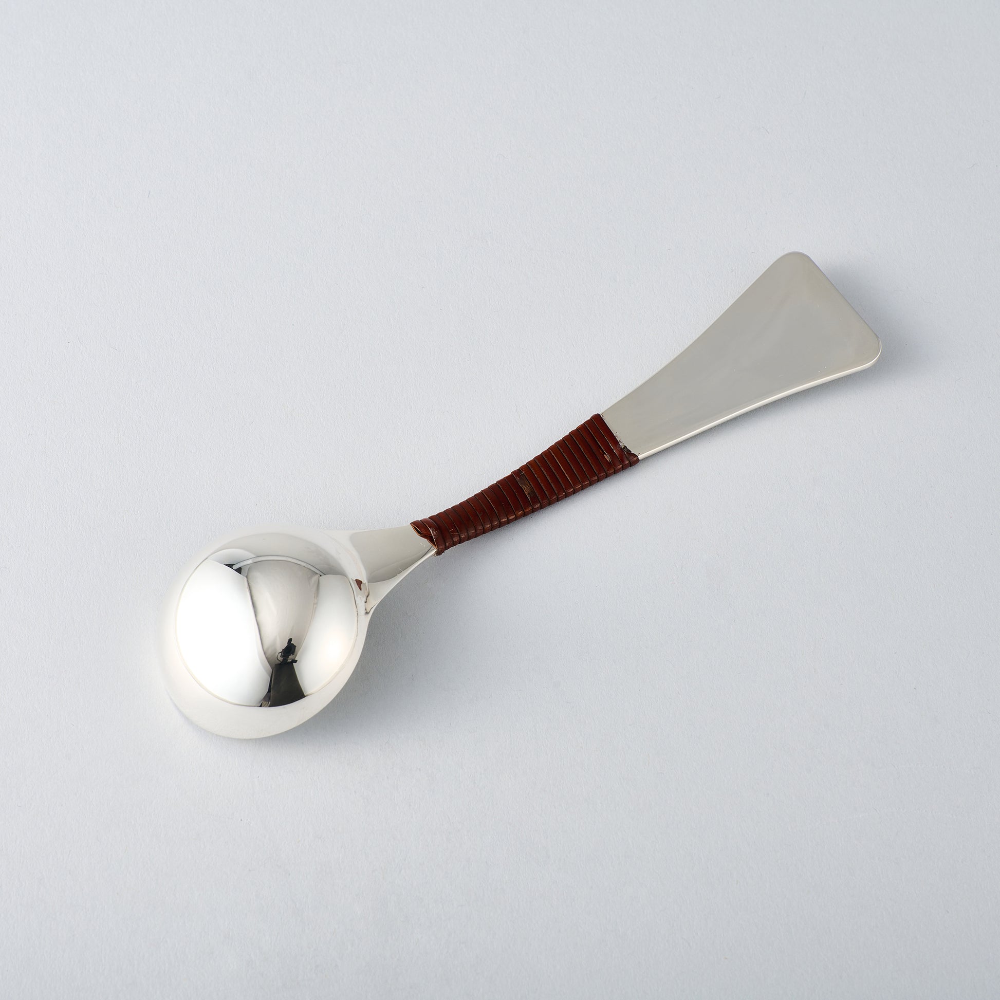 銀製のカッピングスプーンです。持ち手の籐巻きも東京の伝統工芸です。