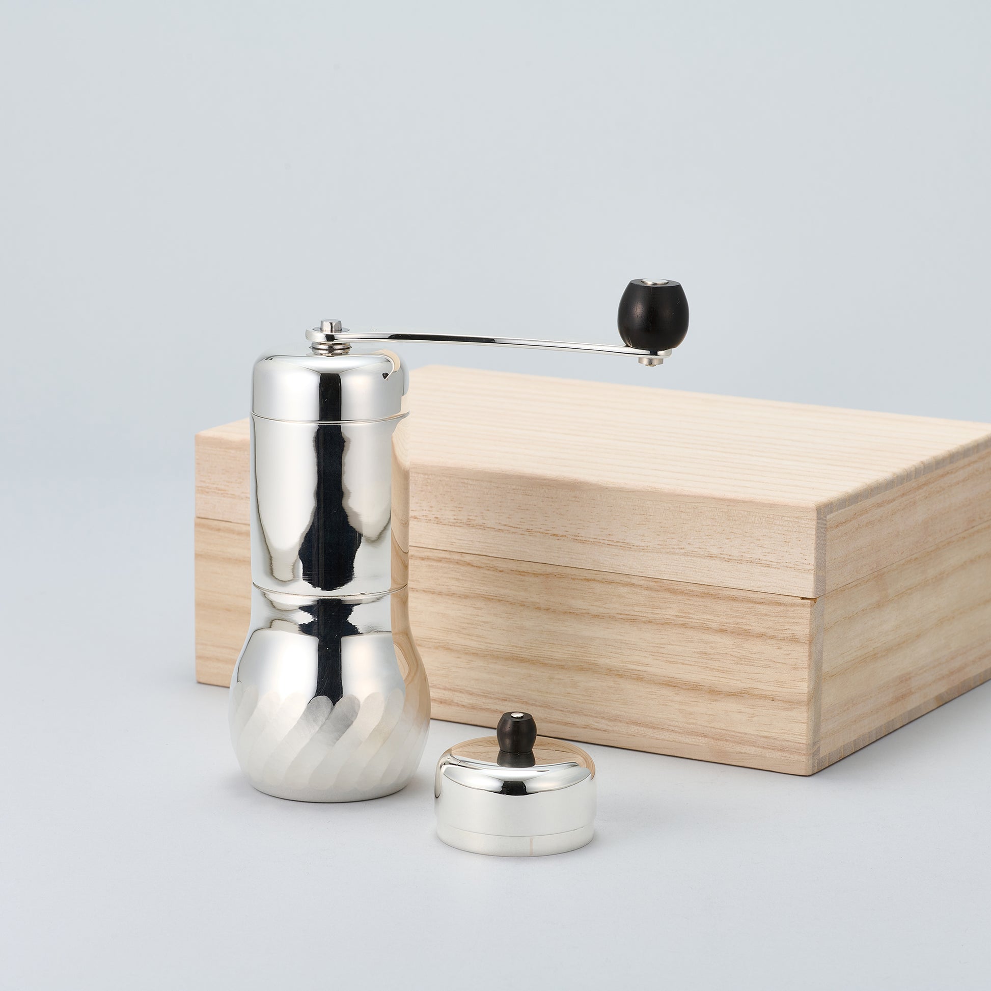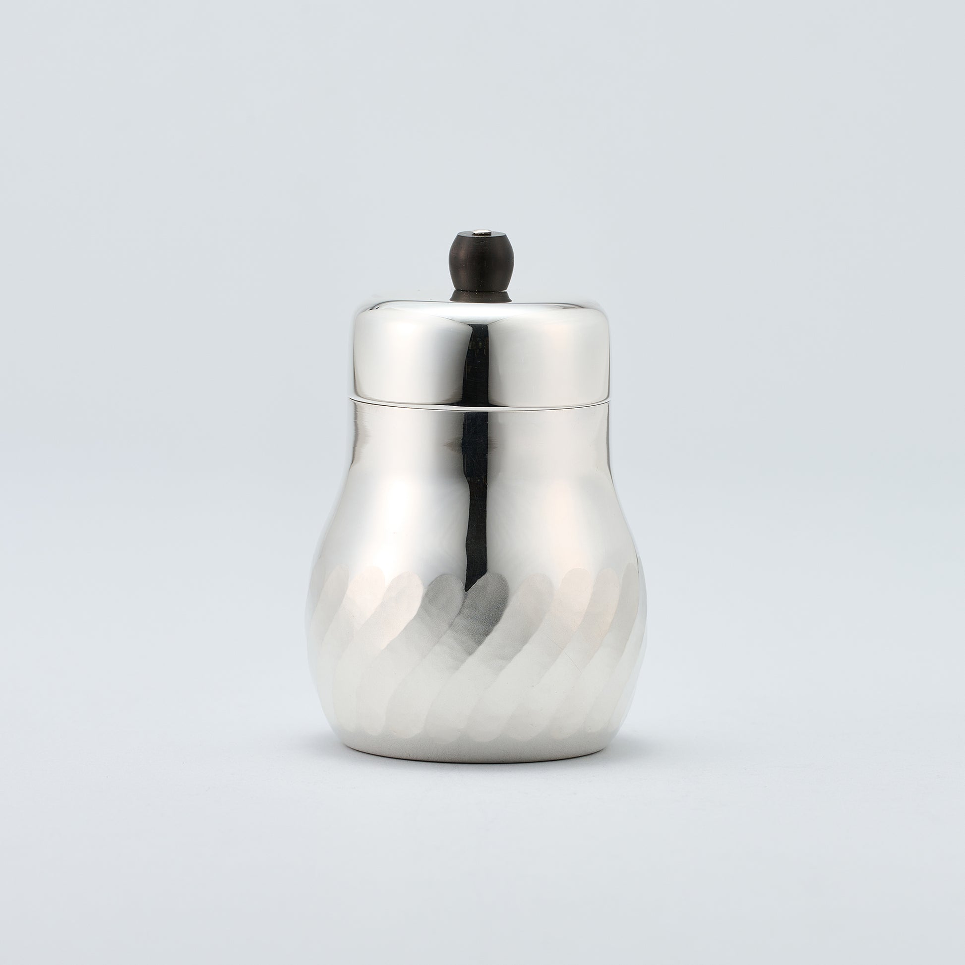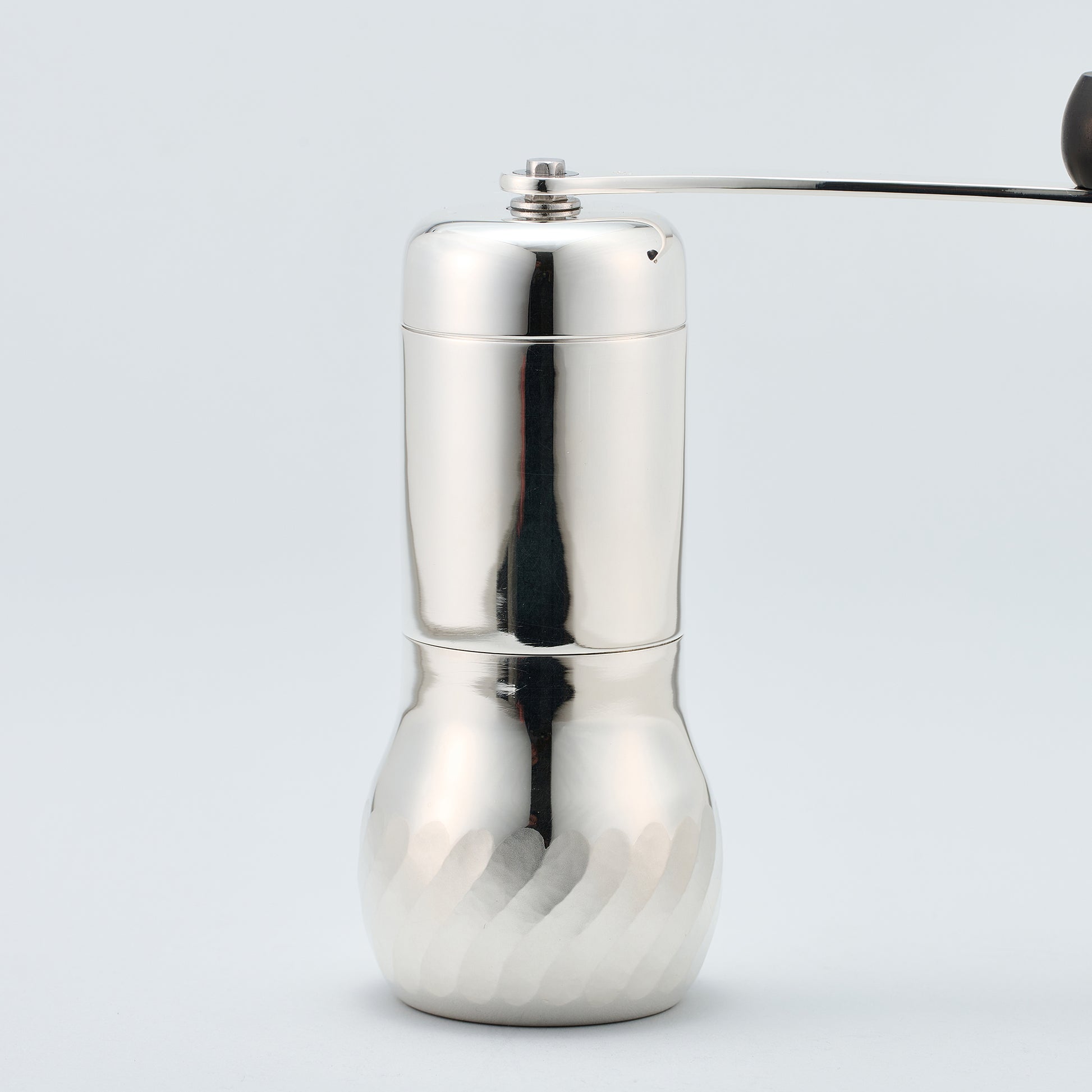 銀製の抹茶ミルです。茶葉を挽いてお抹茶にします。お抹茶が入る下側の部分にはひねりのある立筋の文様が施されます。