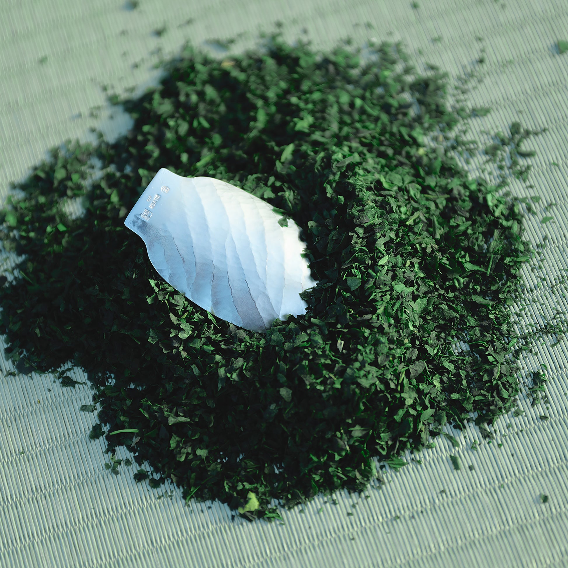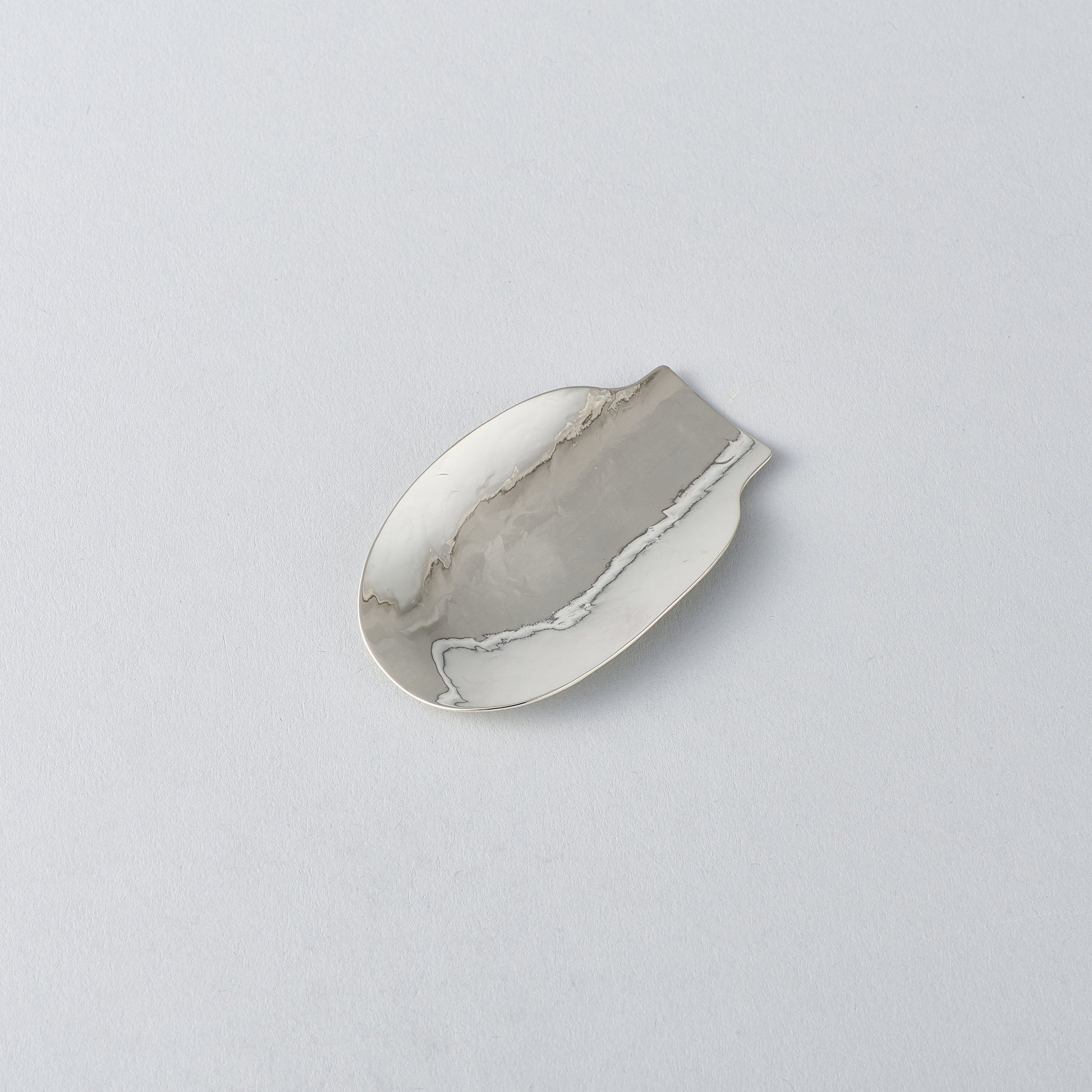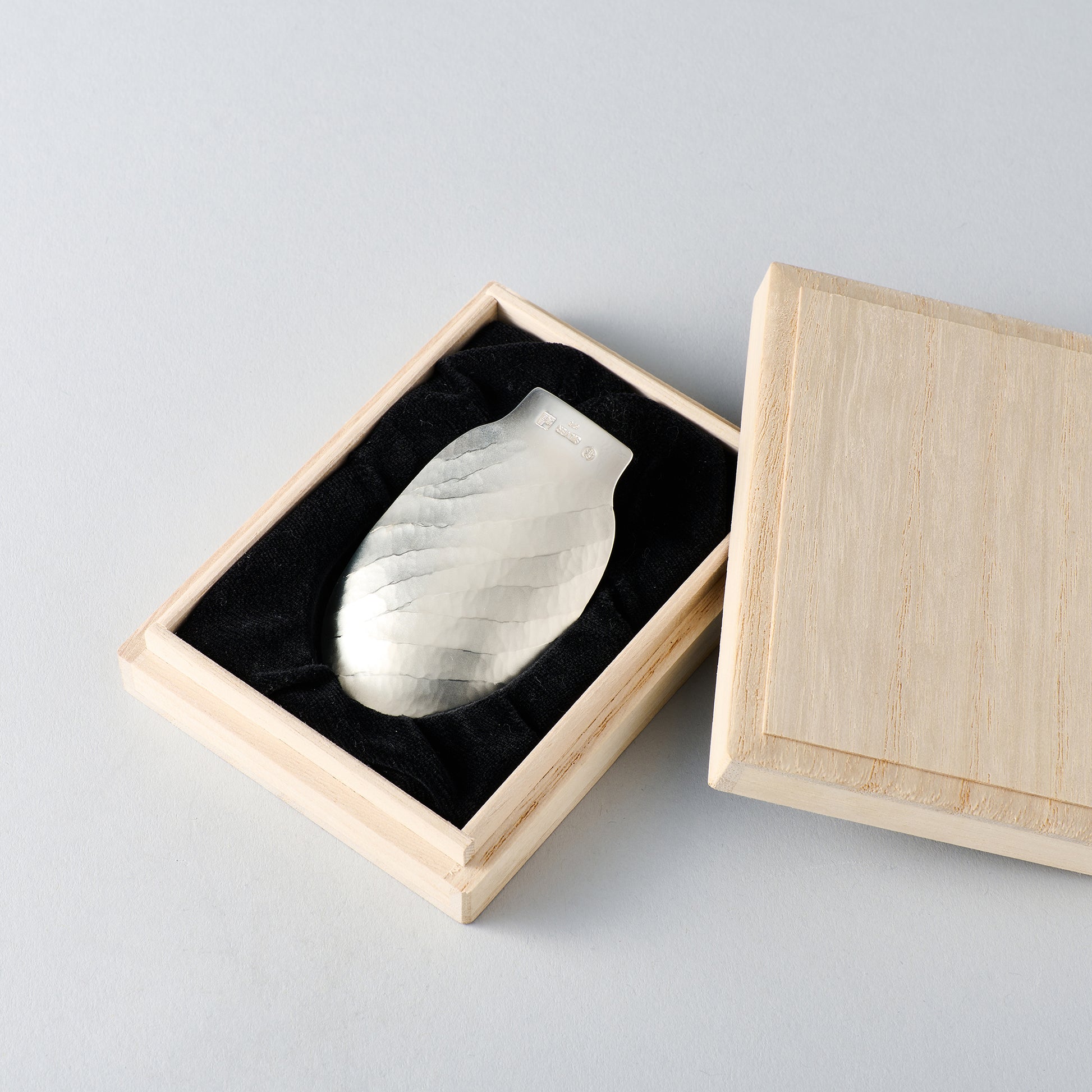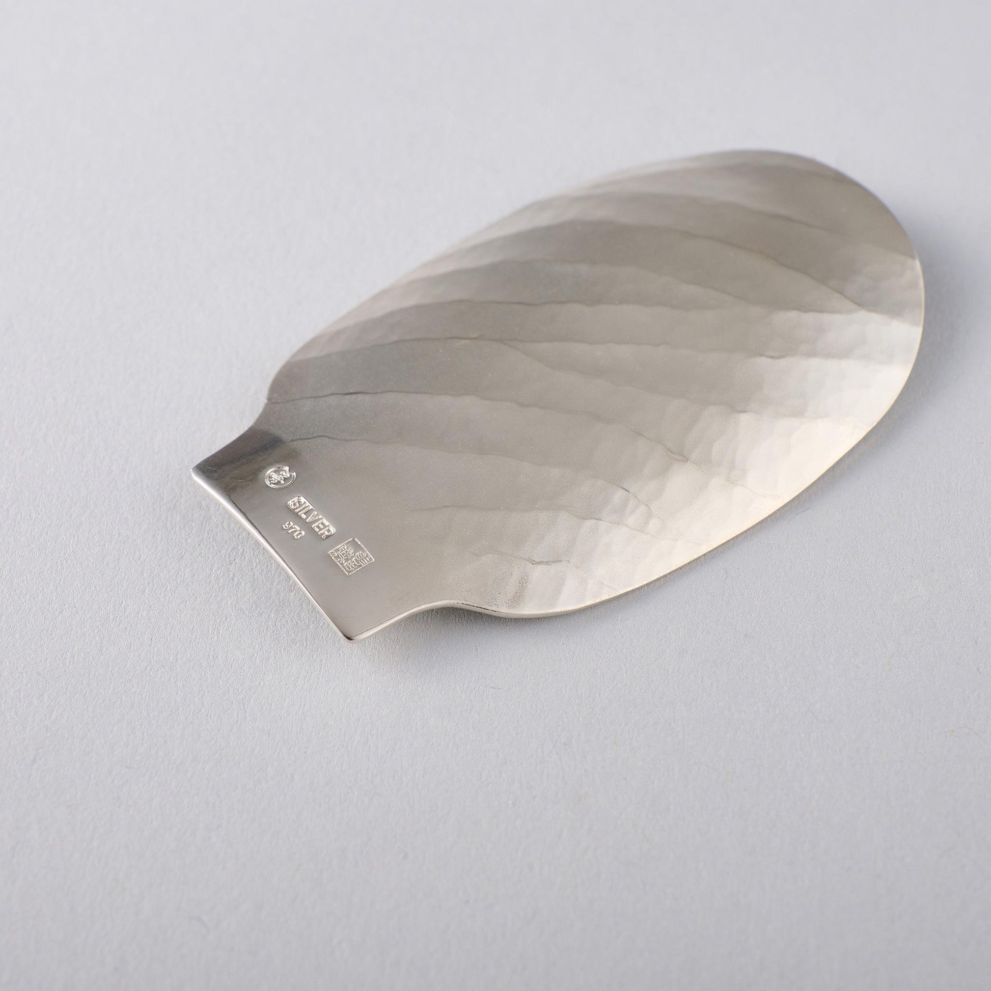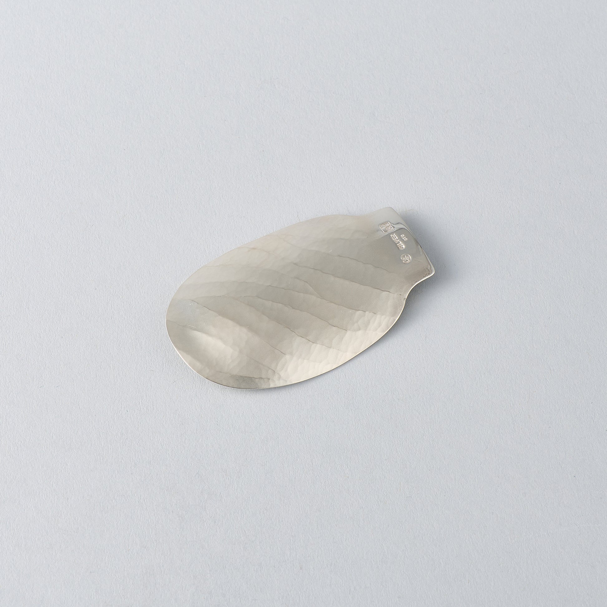 銀製の茶さじです。表面に植物の葉脈を模した不規則な立筋を施した文様の仕上げです。