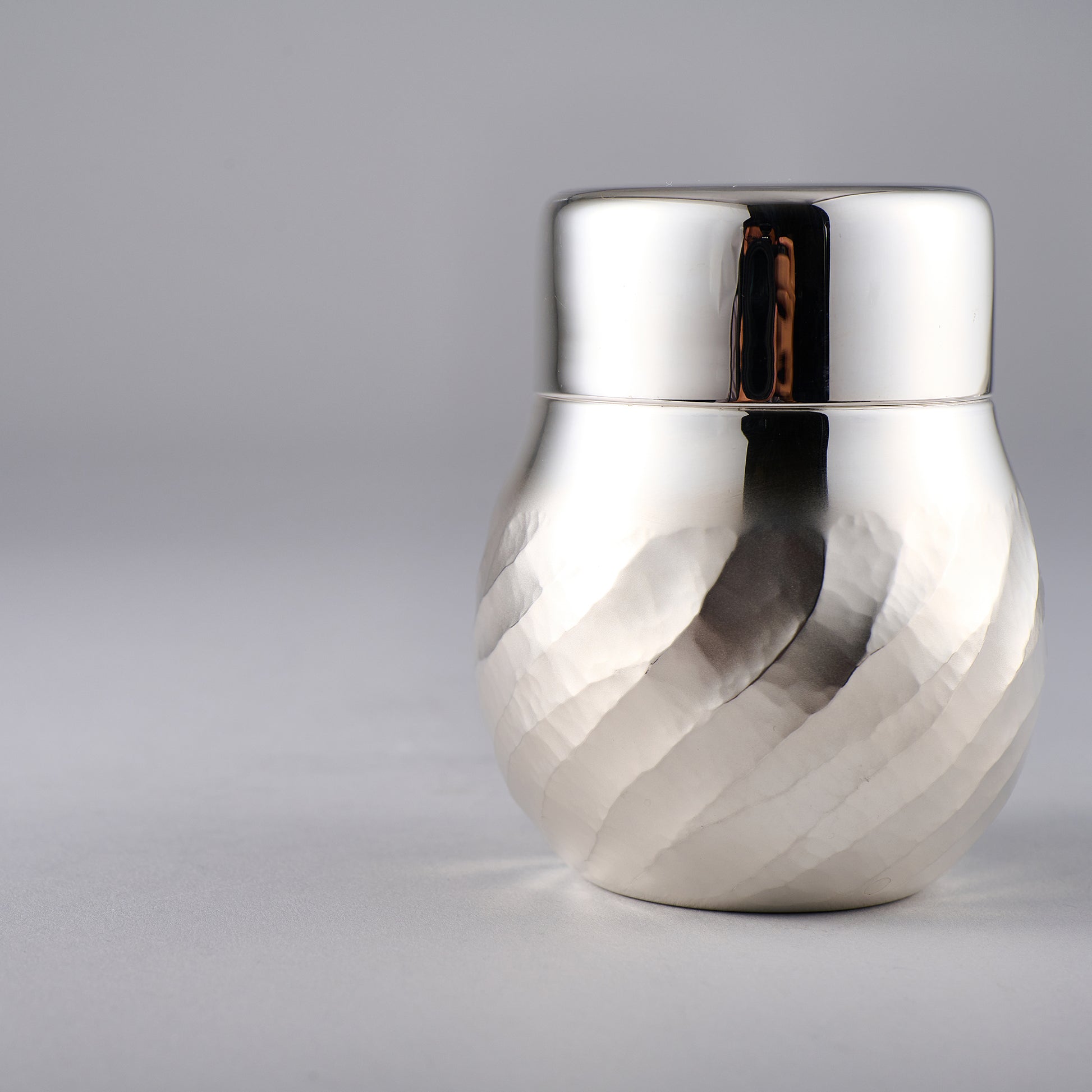 銀製の茶筒です。中蓋も全て銀製です。表面には植物の葉脈を模した不規則な文様を施した仕上げになります。