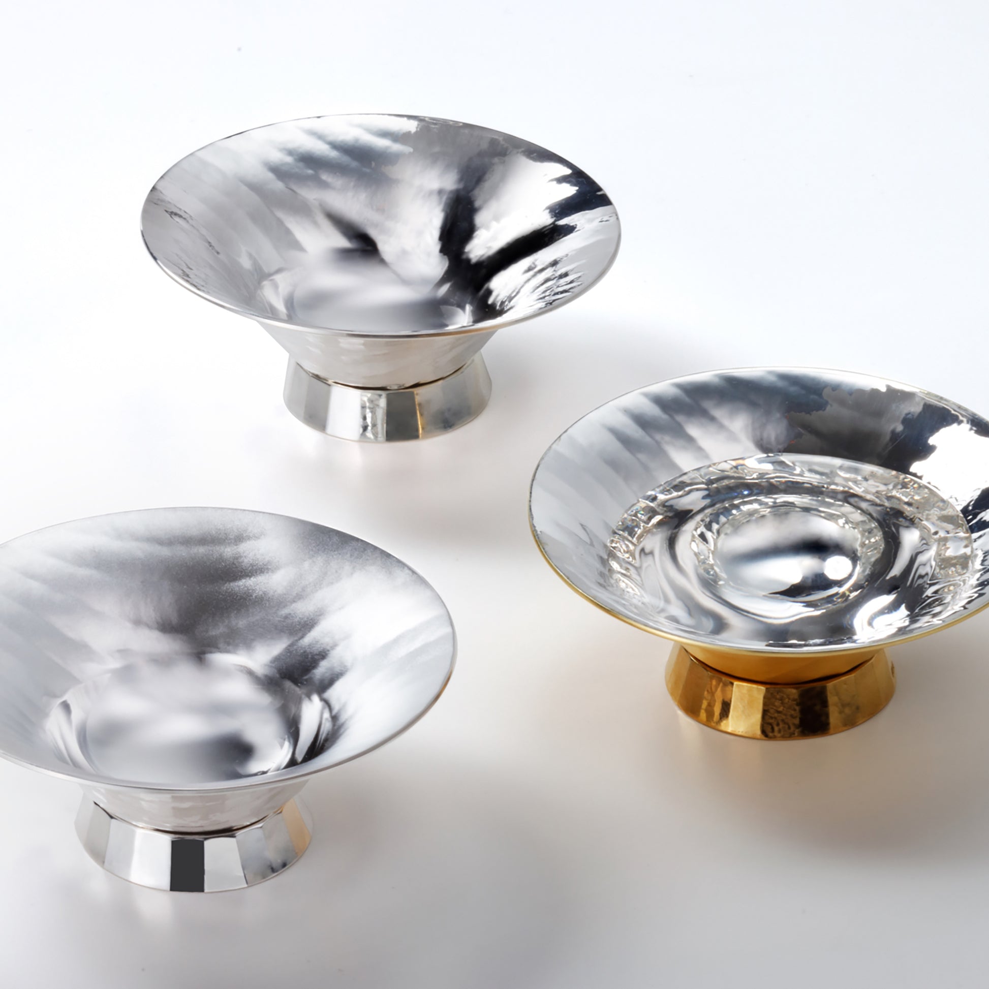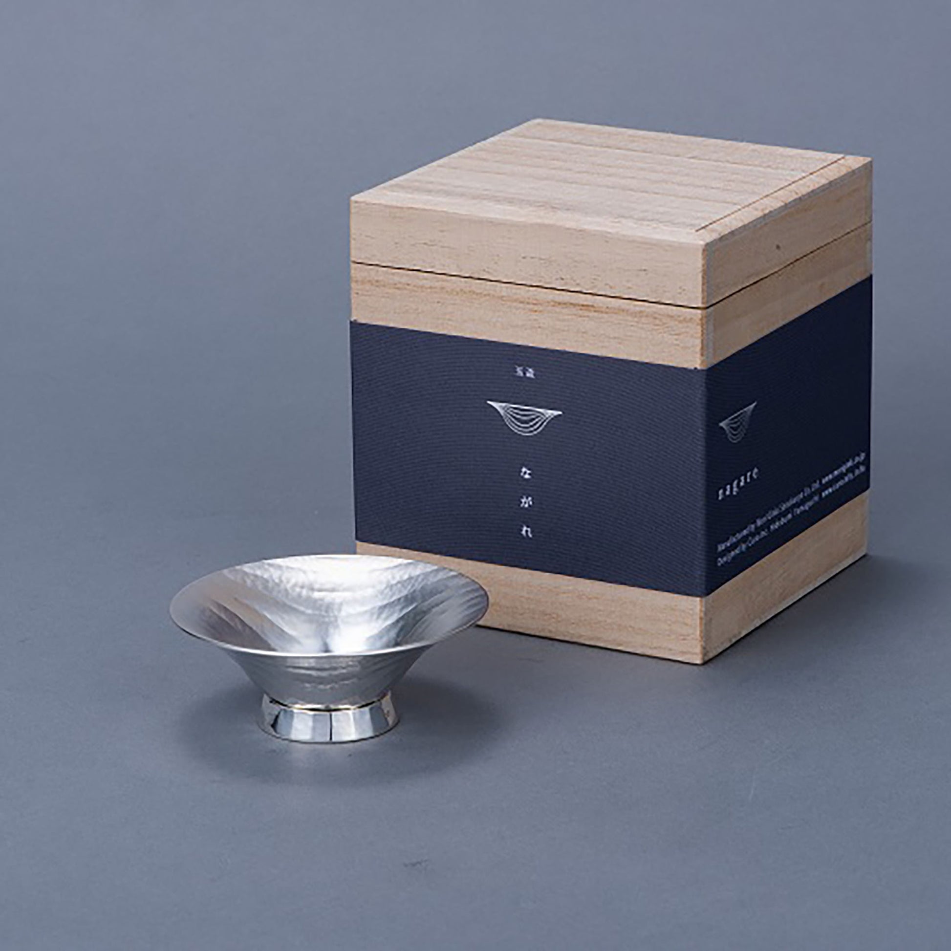 お酒を注ぐと白く輝く銀の盃に玉が浮かびあがります。「玉盃 ながれ」は水の流れのようなラインがデザインされているため、玉の周囲には王冠のような映り込みも現れます。