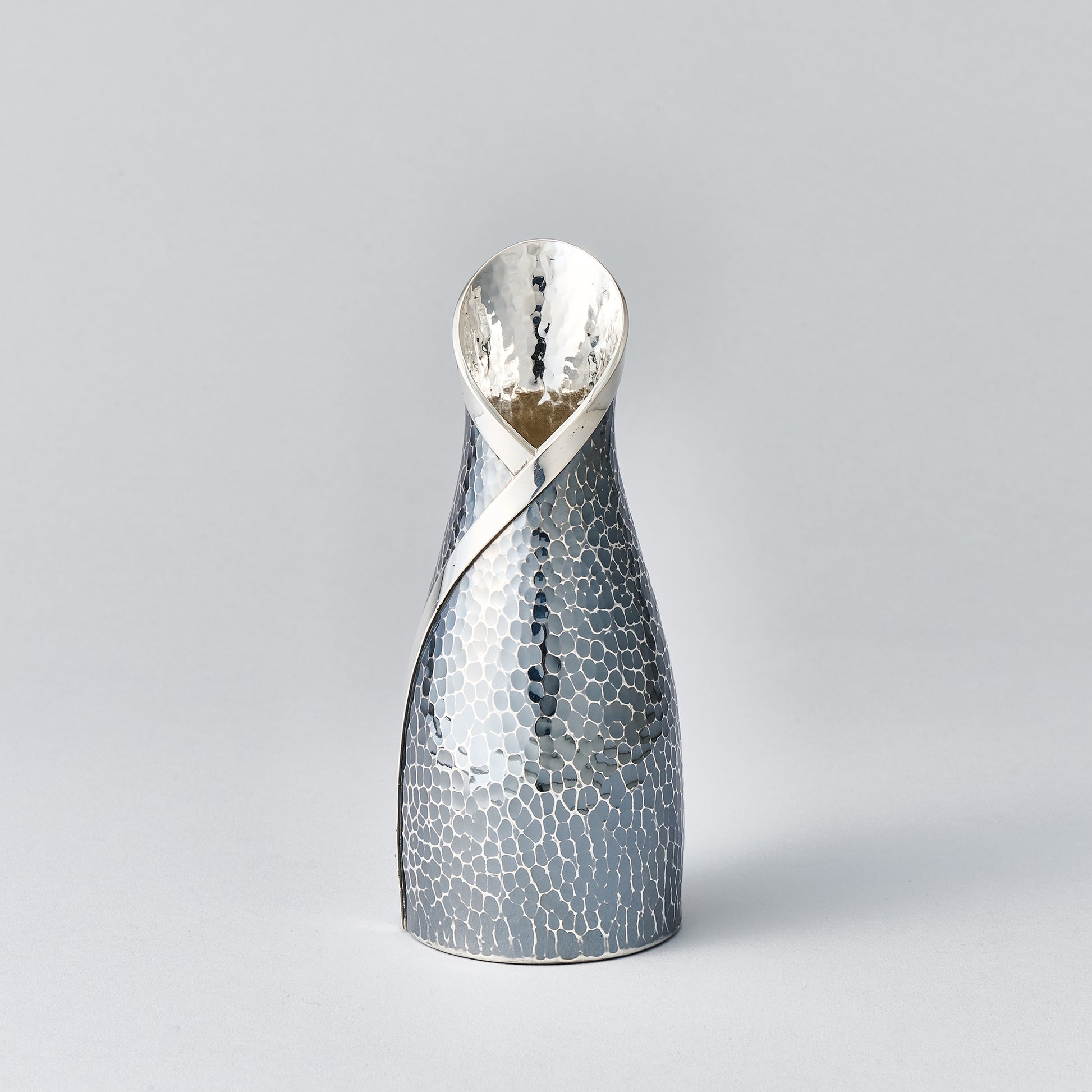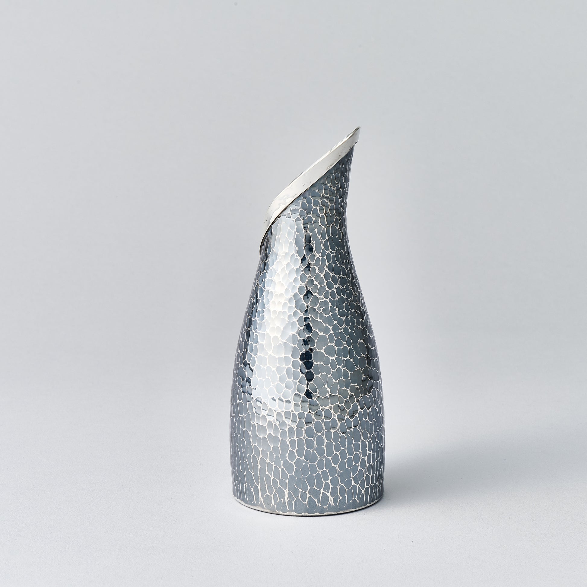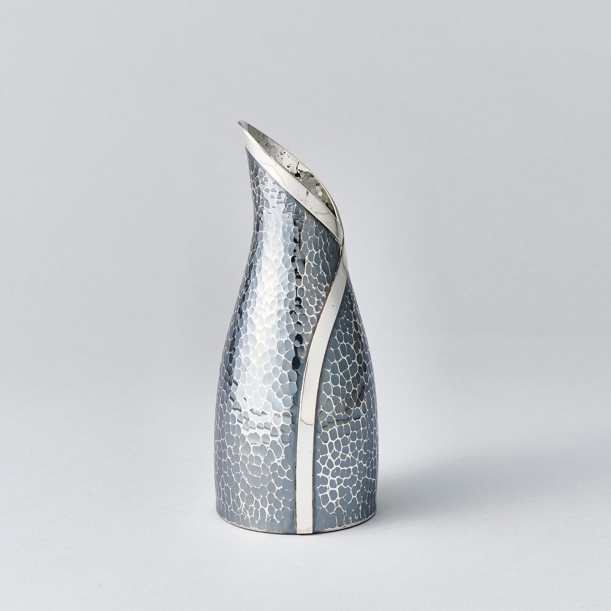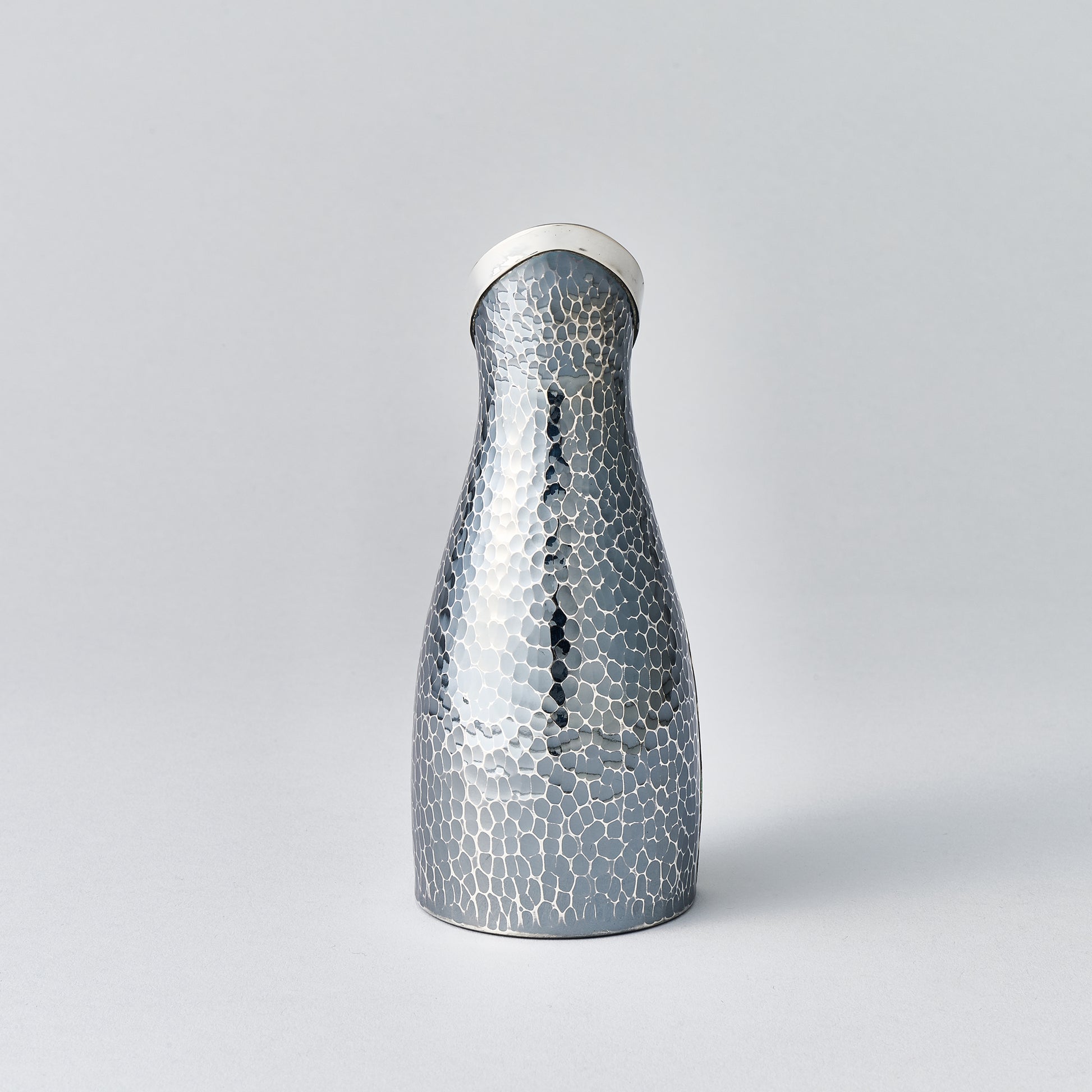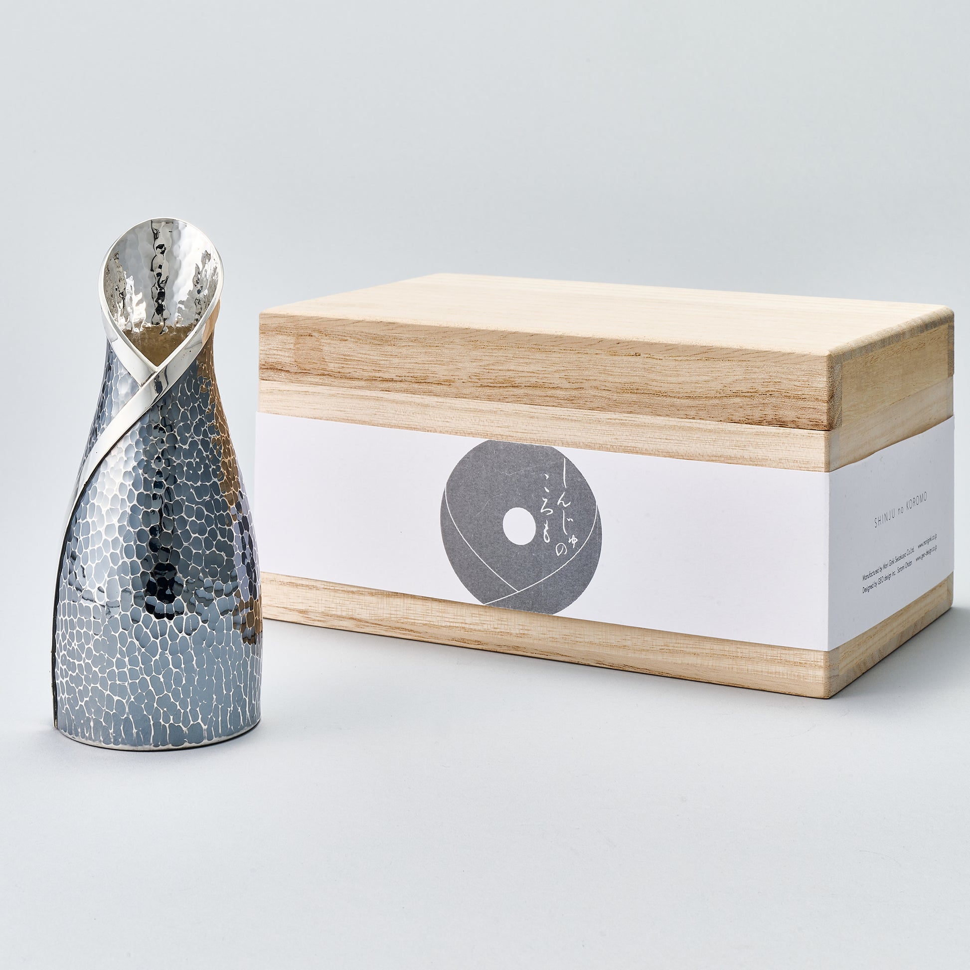 着物をまとったような姿の純銀の徳利です。徳利のくびれは持ちやすさと、衿を持ち着物のシルエットも表しています。表面は”鎚目(ツチメ)”という金鎚で叩いた跡を残す文様をして、薬品により黒く古色を付ける古美仕上げです。