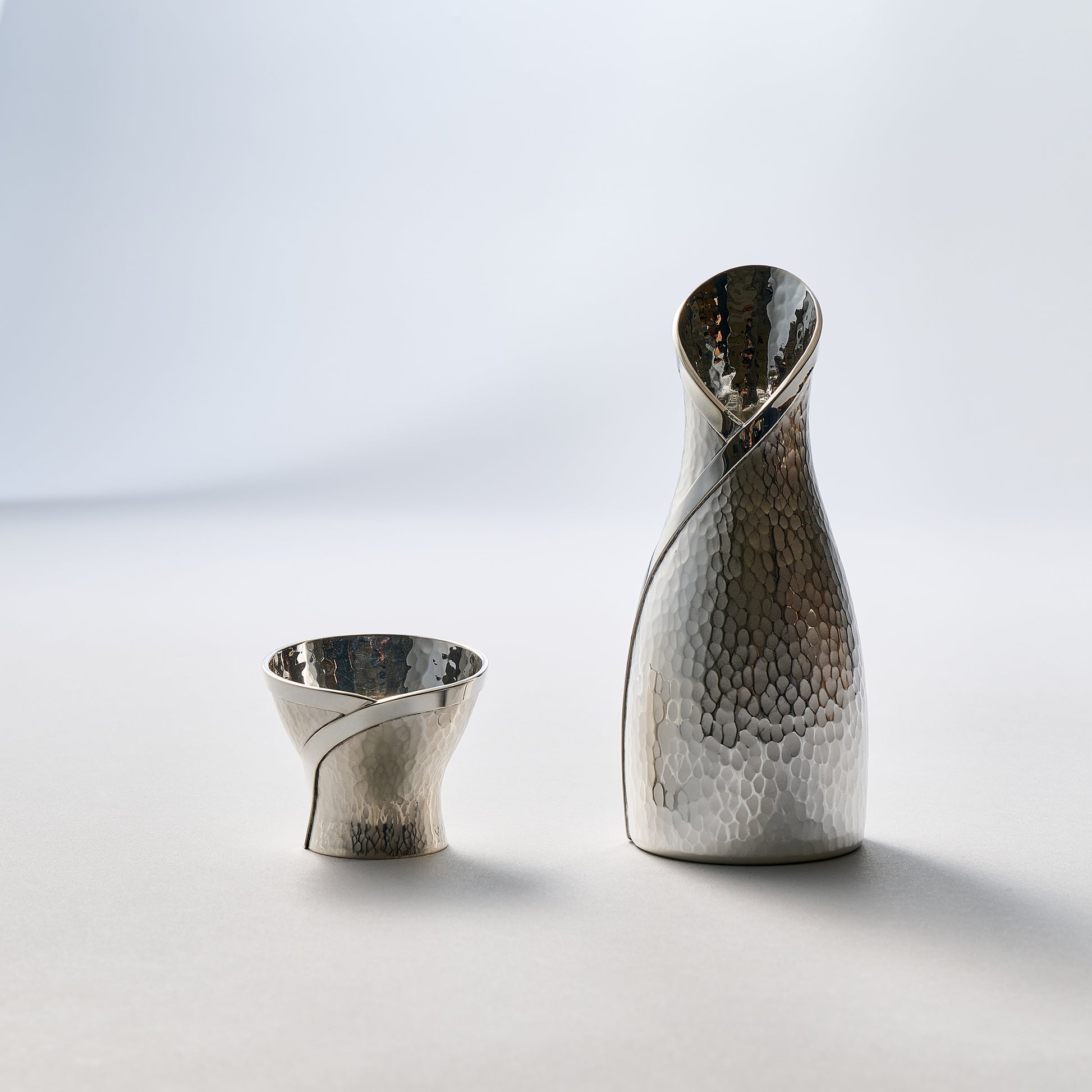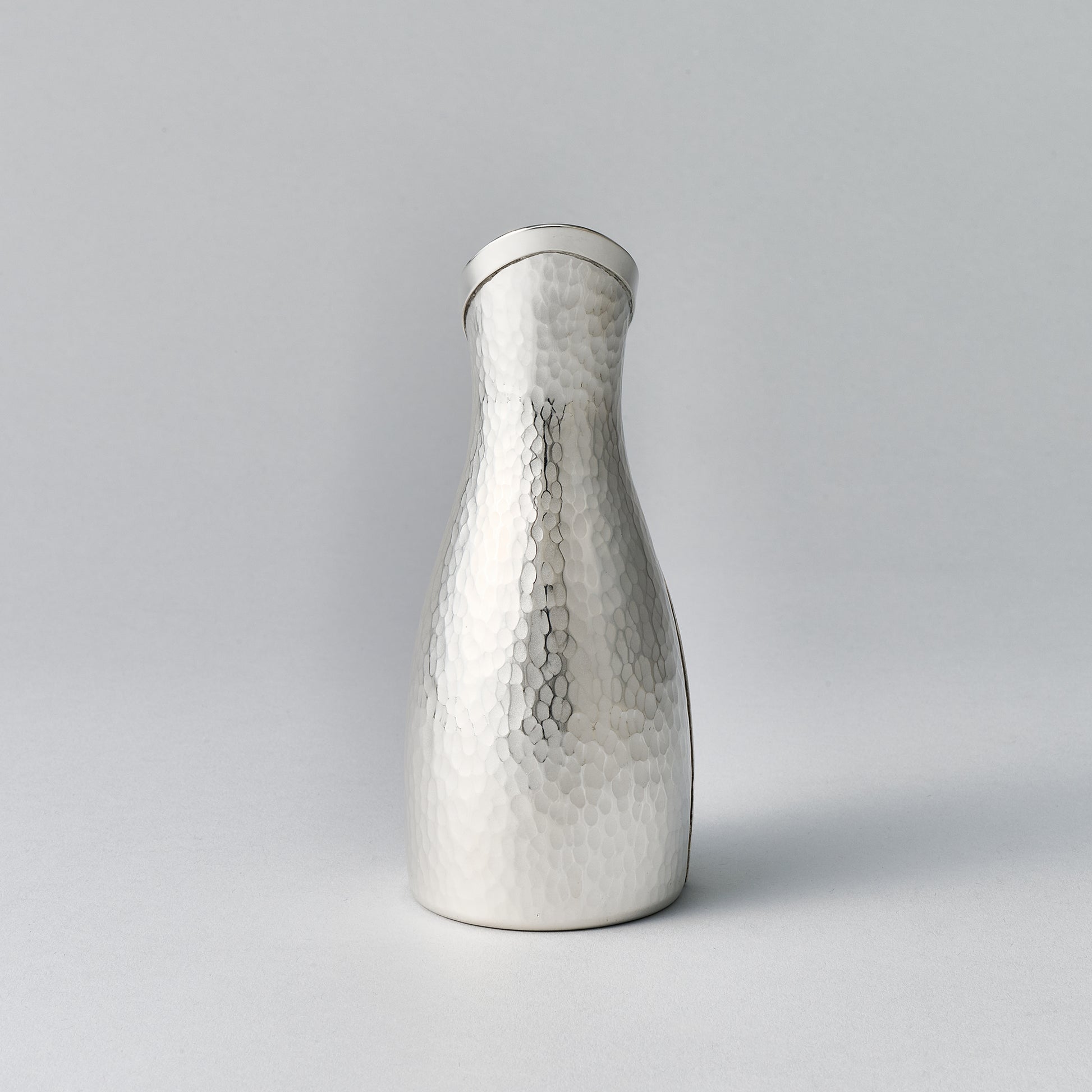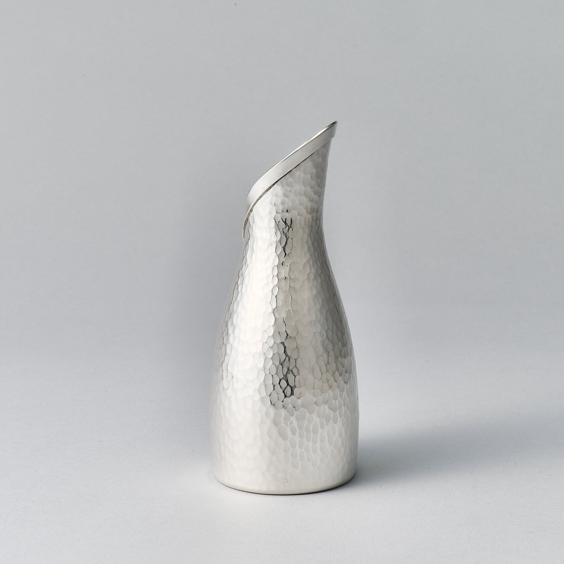 着物をまとったような姿の純銀の徳利です。徳利のくびれは持ちやすさと、衿を持ち着物のシルエットも表しています。表面には”鎚目(ツチメ)”という金鎚で叩いた跡を残す文様をして、ツヤを消す梨地処理をして仕上げています。