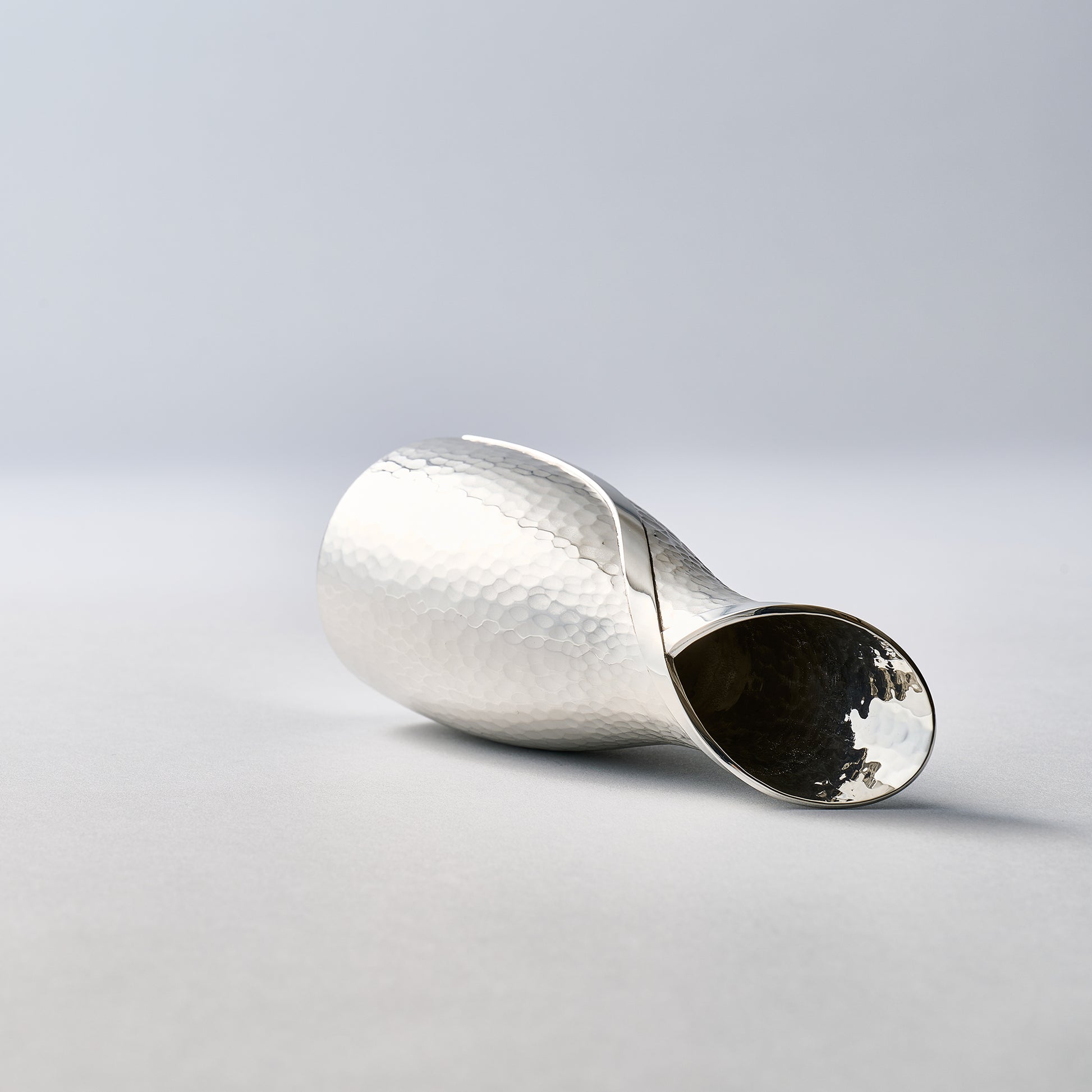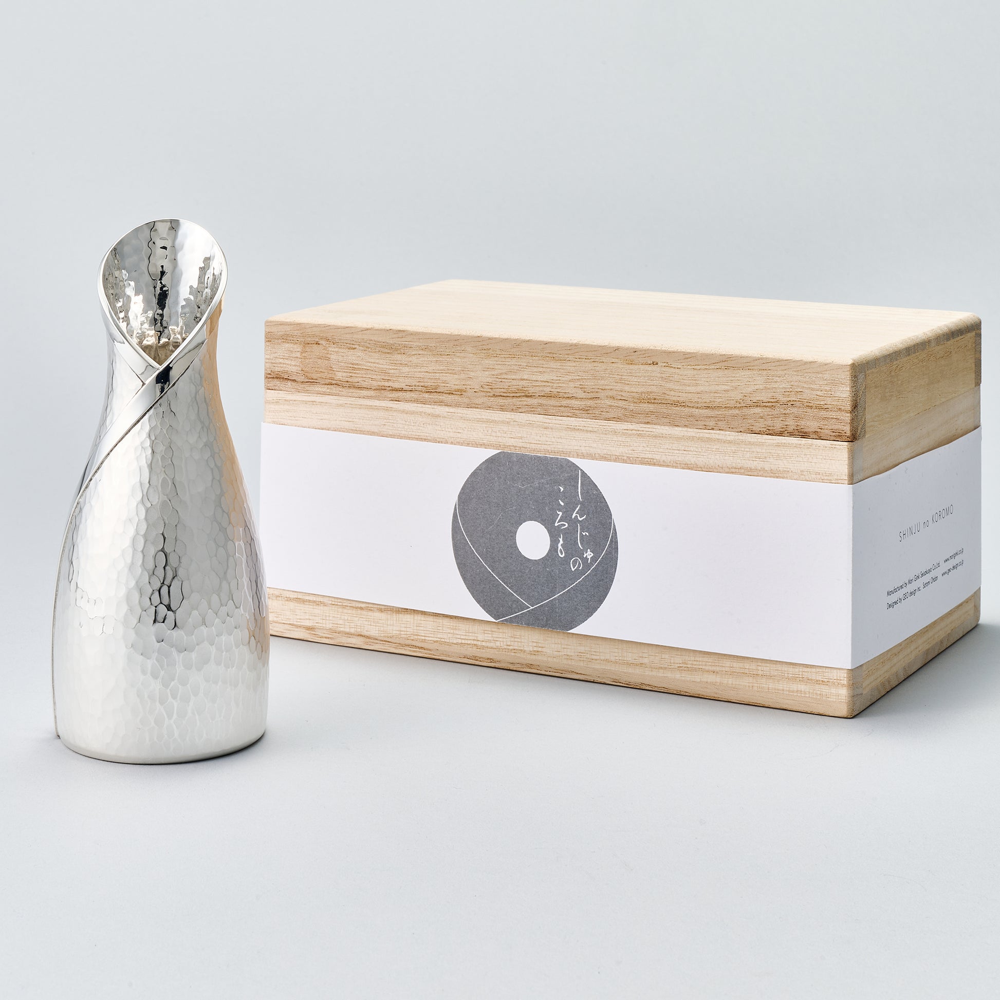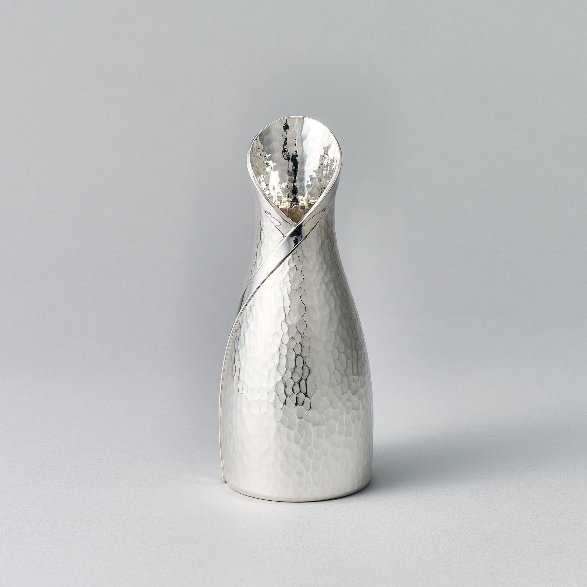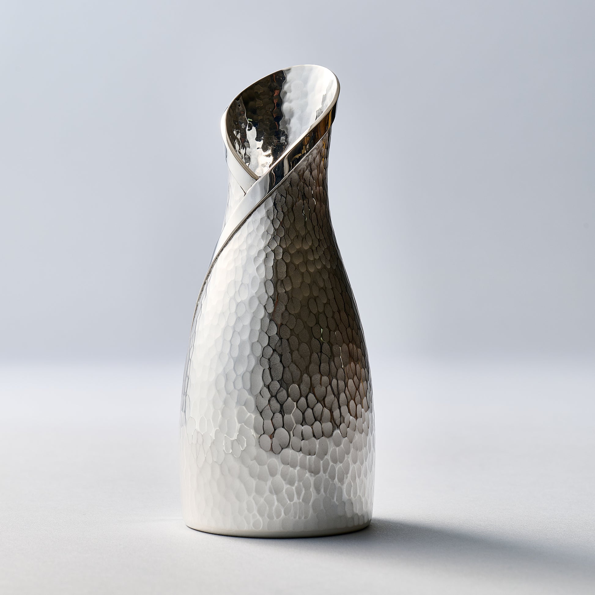 着物をまとったような姿の純銀の徳利です。徳利のくびれは持ちやすさと、衿を持ち着物のシルエットも表しています。表面には”鎚目(ツチメ)”という金鎚で叩いた跡を残す文様をして、ツヤを消す梨地処理をして仕上げています。