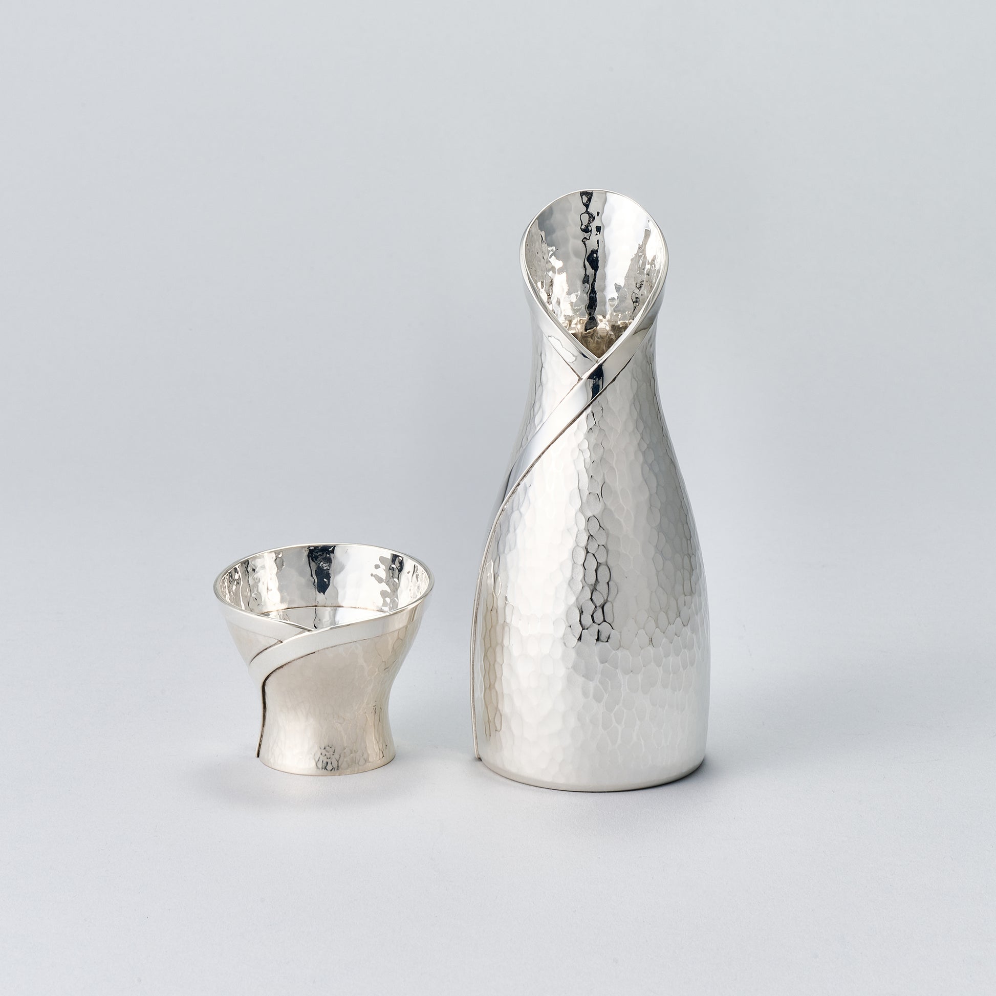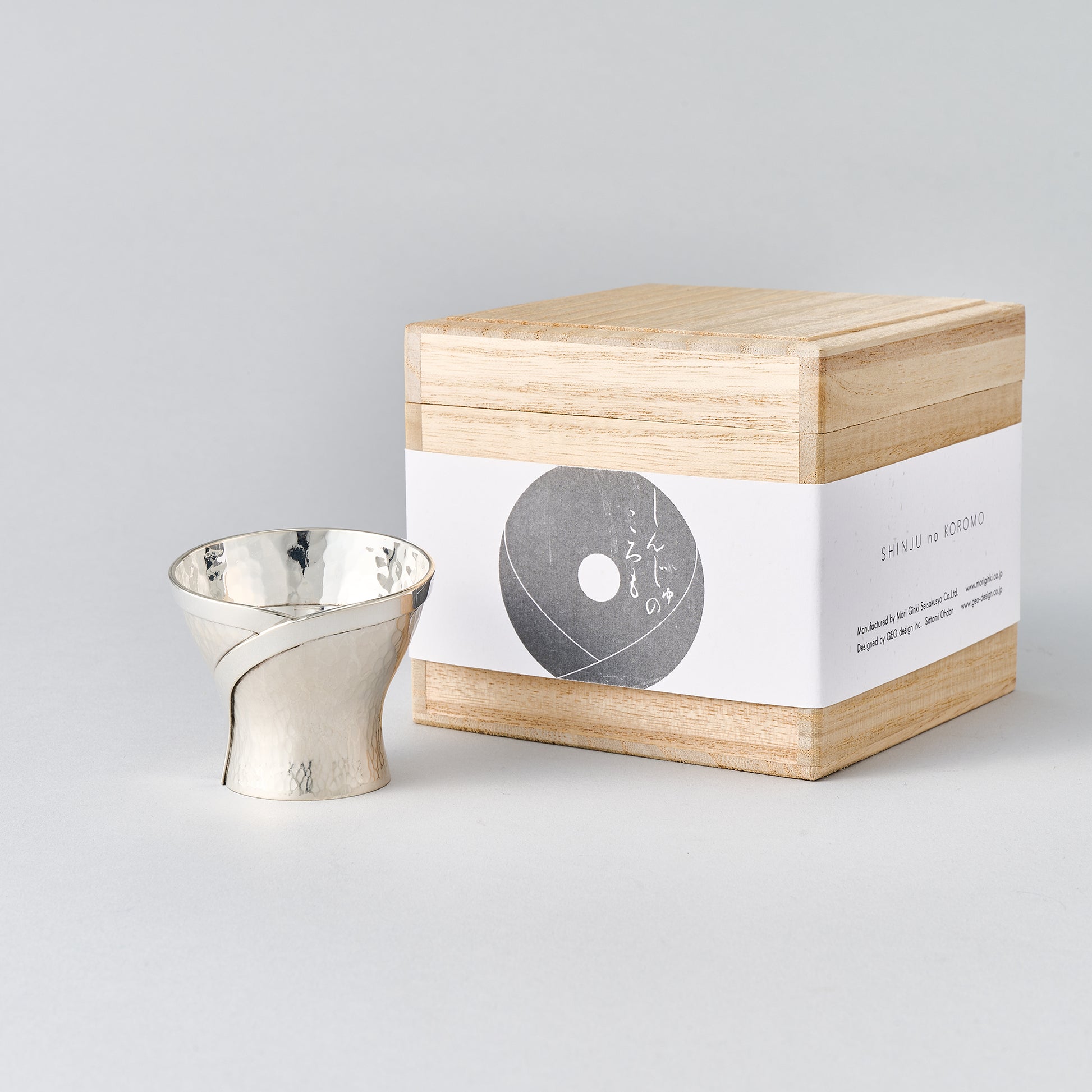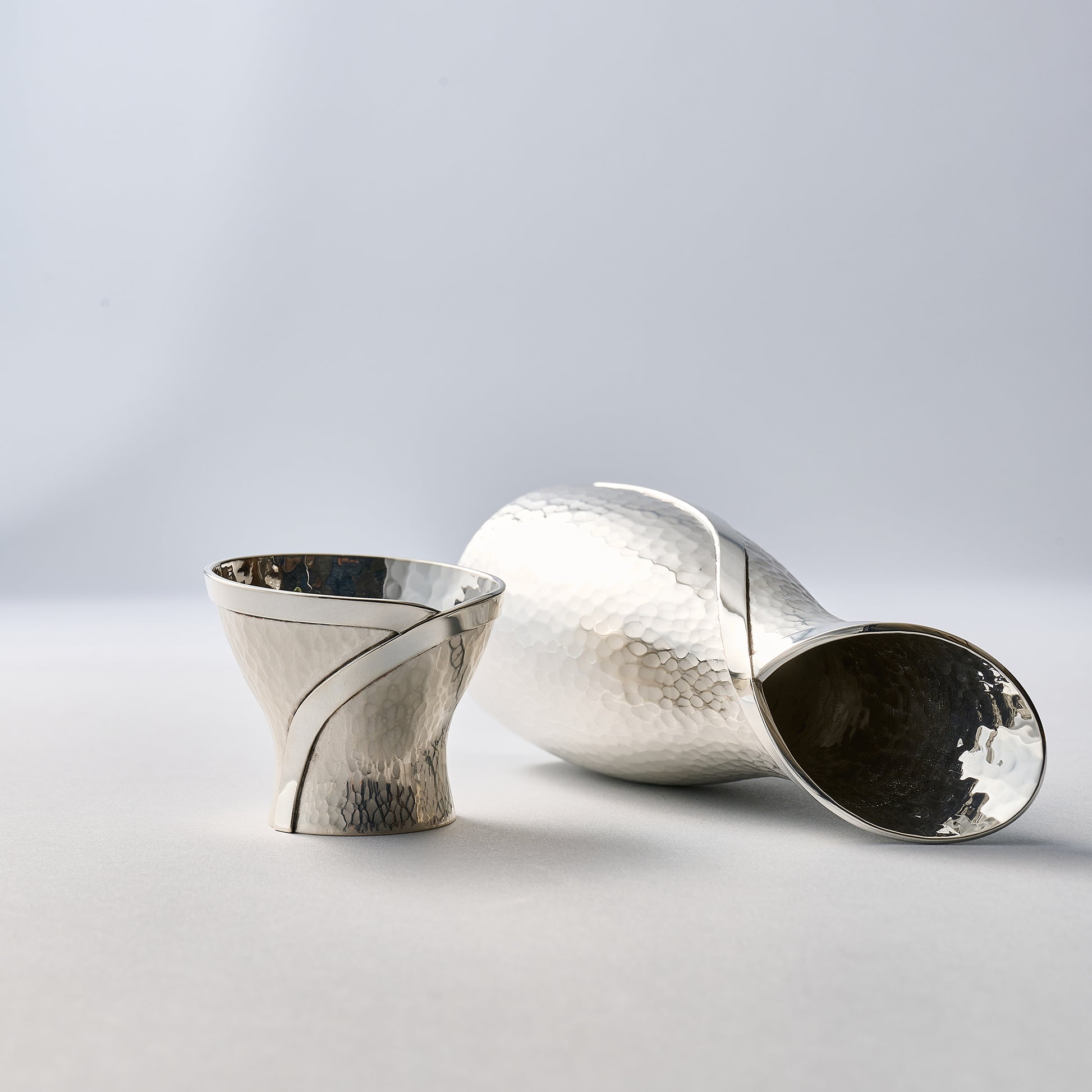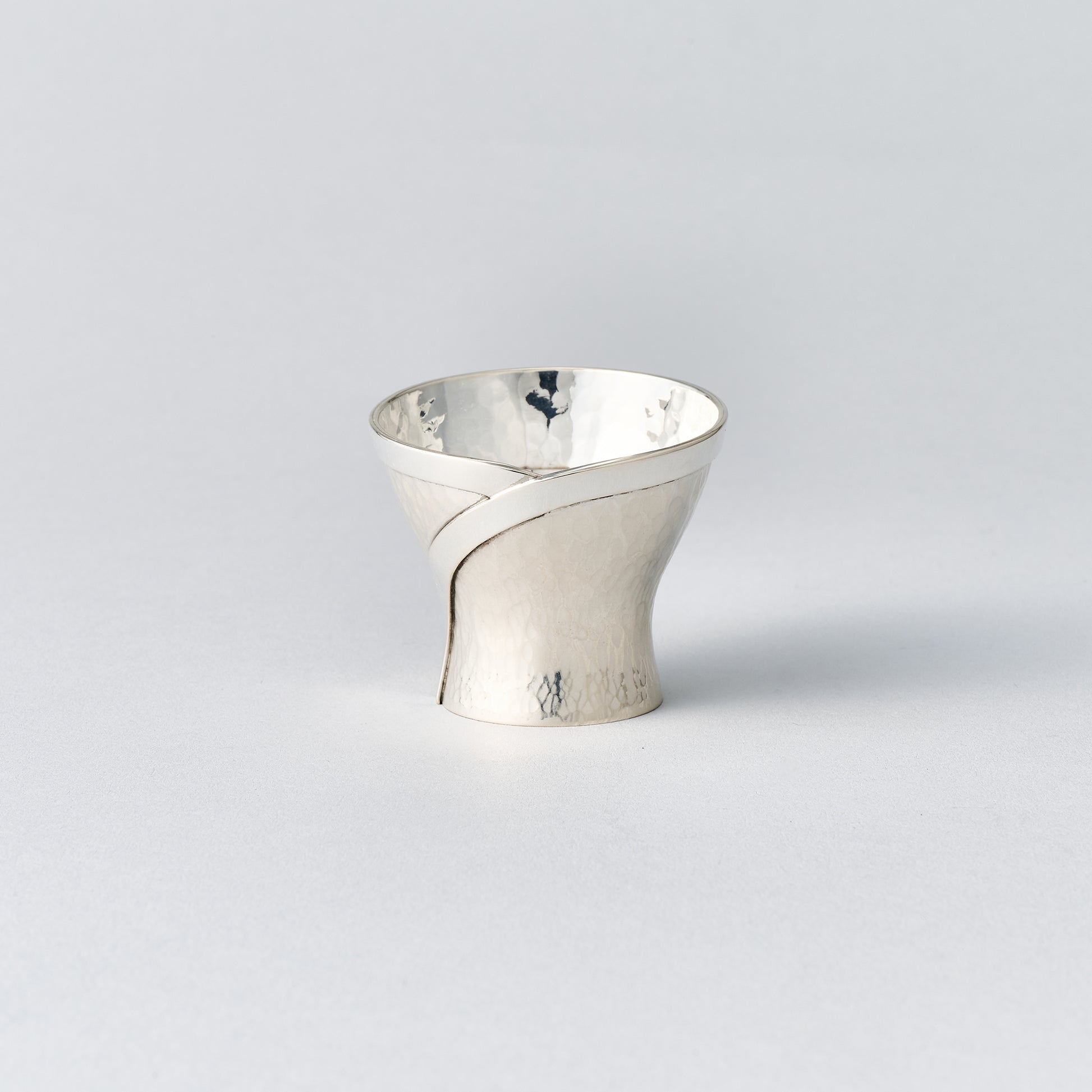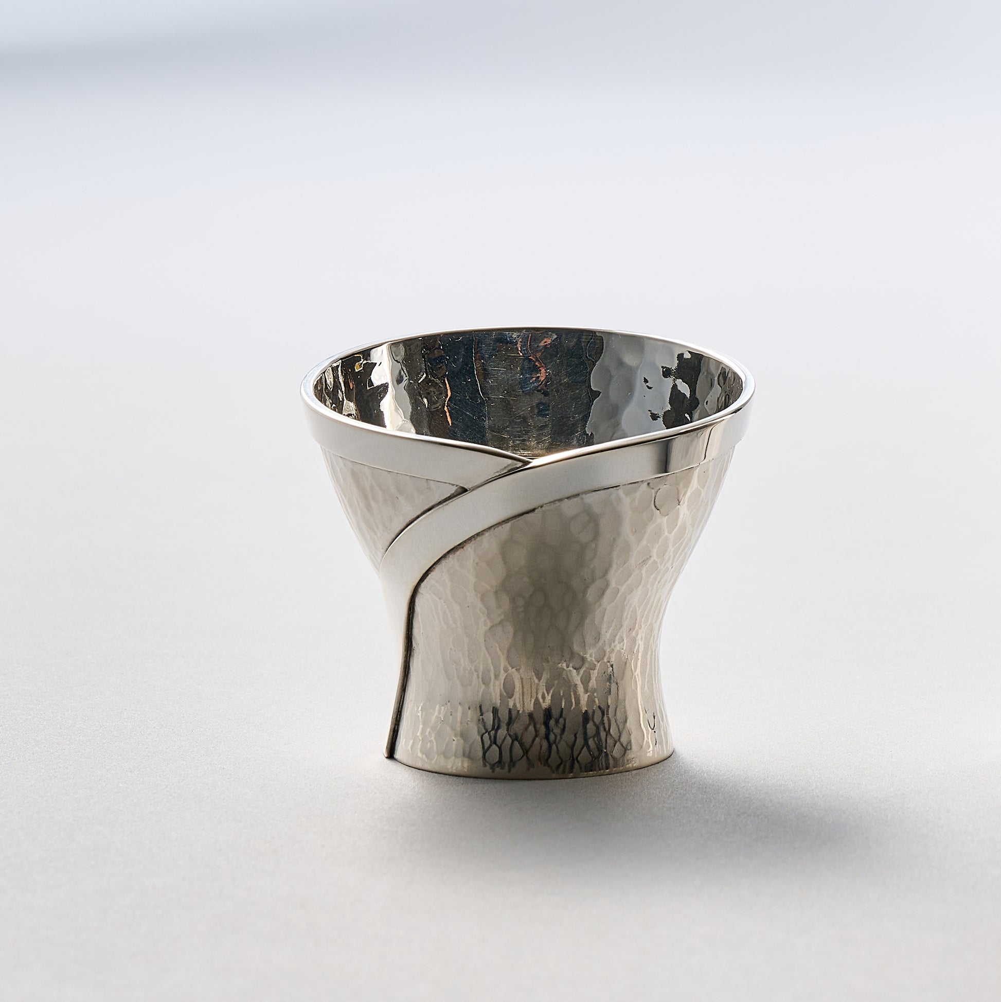 着物をまとったような姿の純銀玉盃です。お酒を注ぐと真珠のような美しい玉が盃の中に浮かび上がり、それを優雅に銀のころもがつつみます。表面には”鎚目(ツチメ)”という金鎚で叩いた跡を残す文様をして、ツヤを消す梨地処理をして仕上げています。
