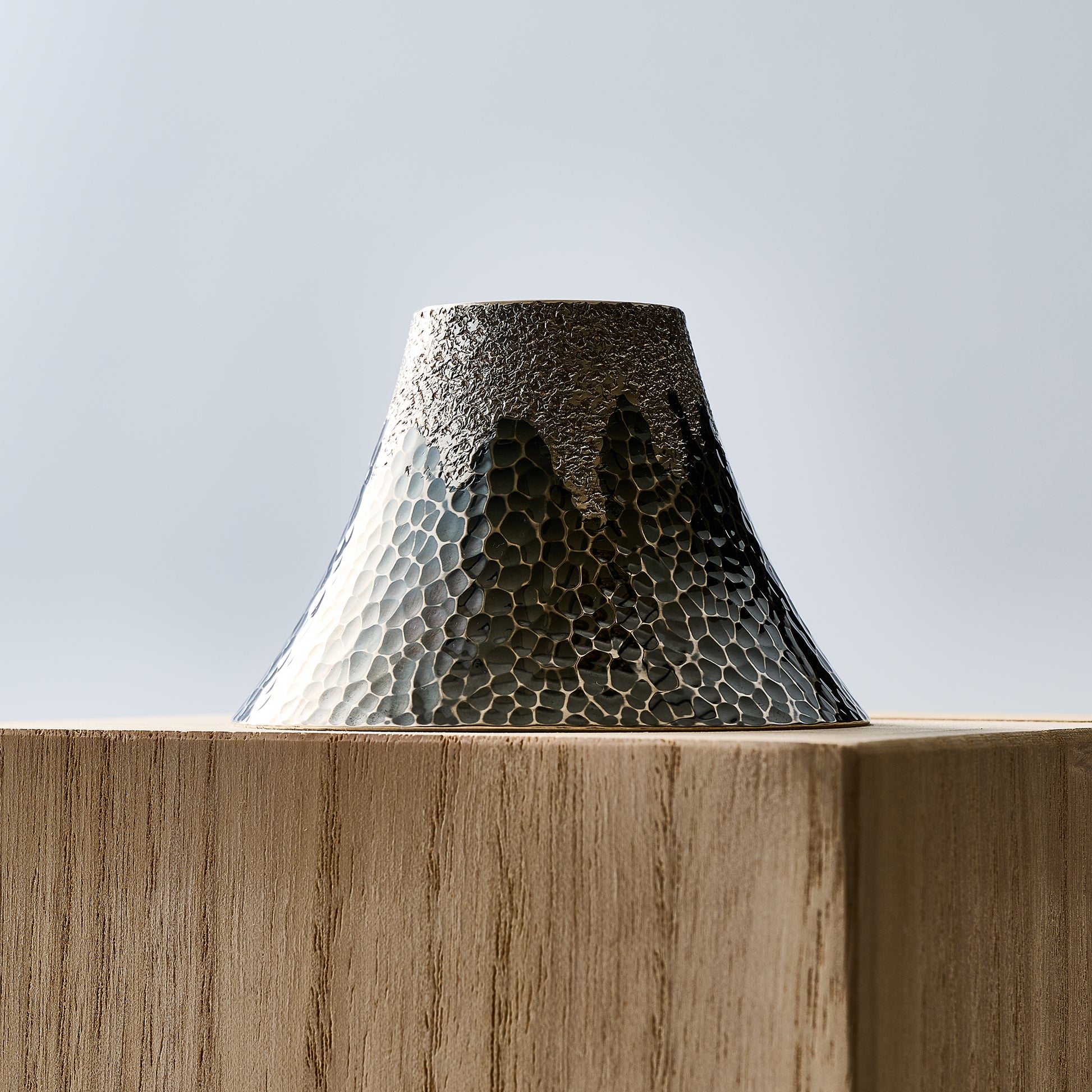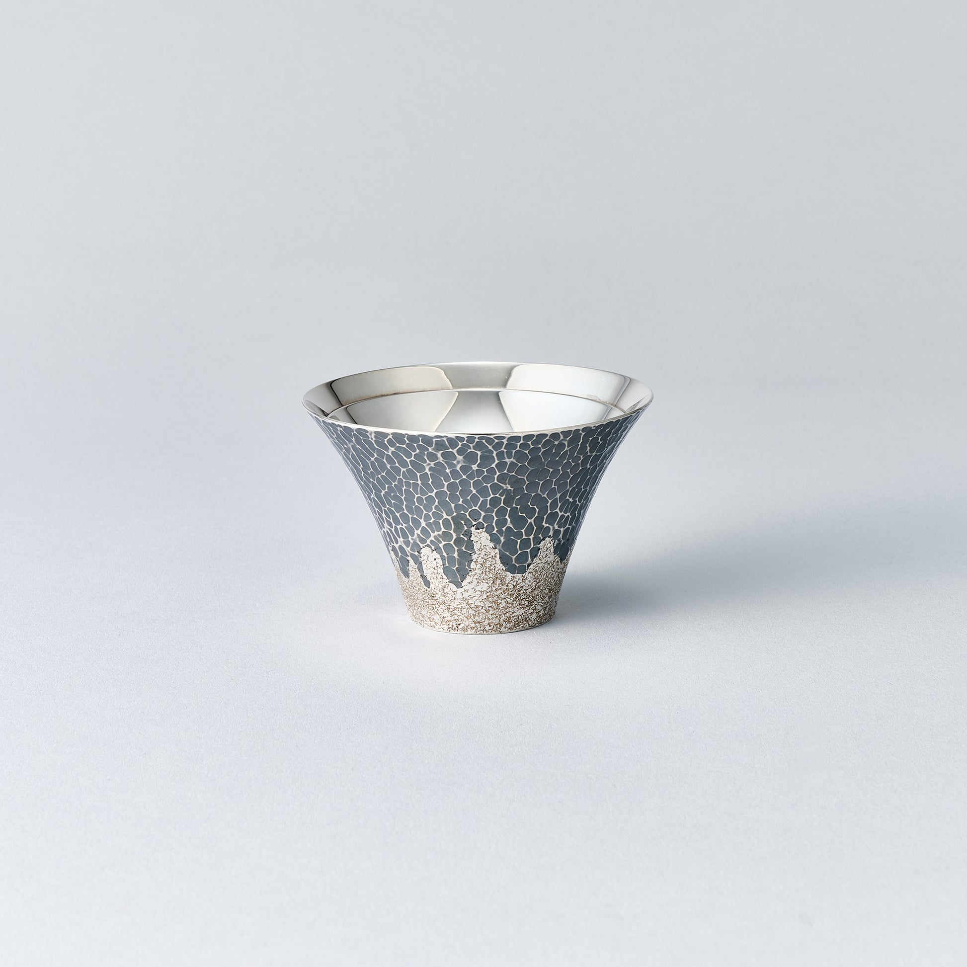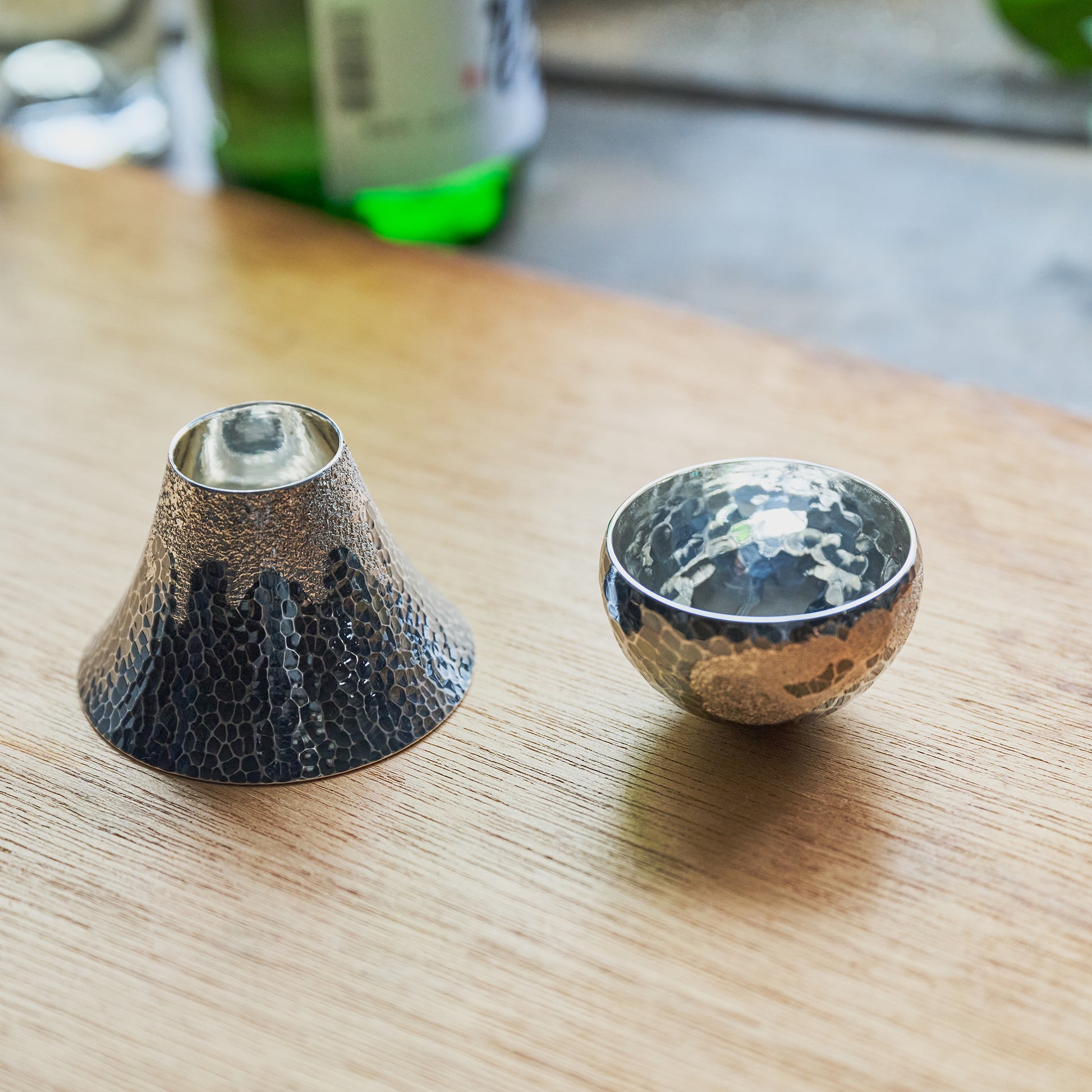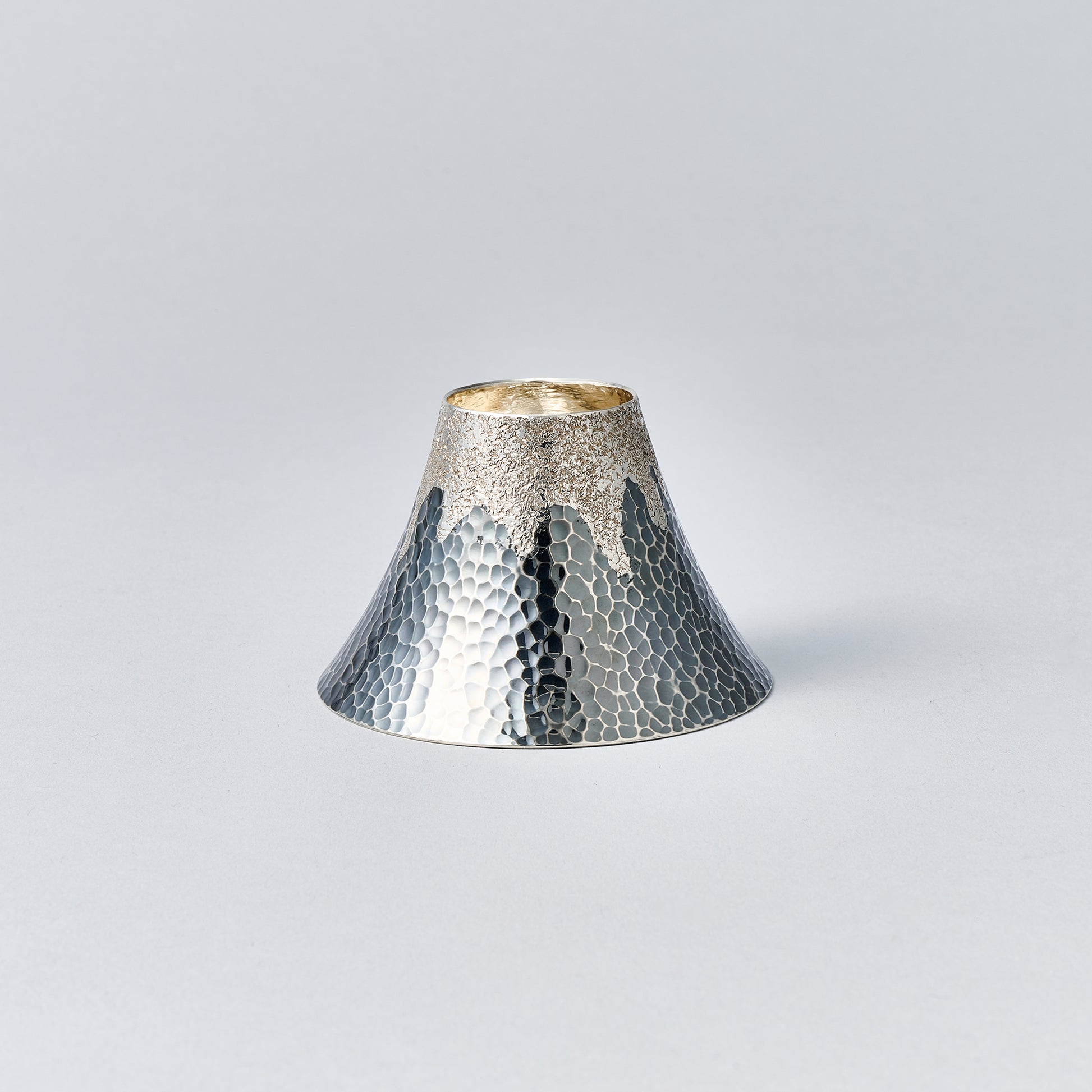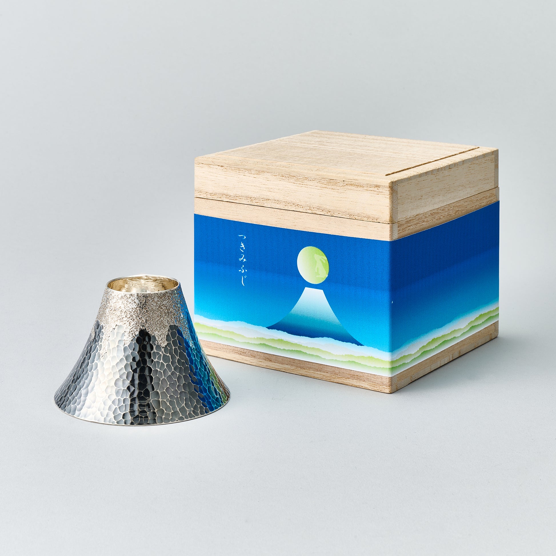 富士山の雪景色を鍛金の技術で表現した純銀玉盃です。「月に兎がいる」という伝承は日本ばかりでなく広くアジアの国々で伝えられています。