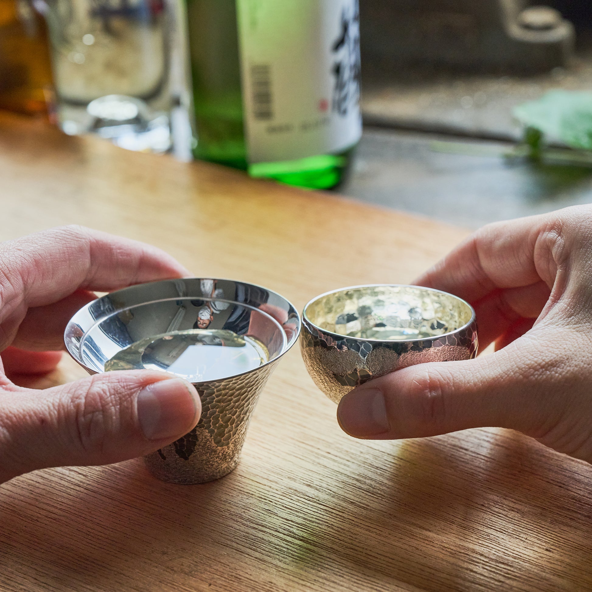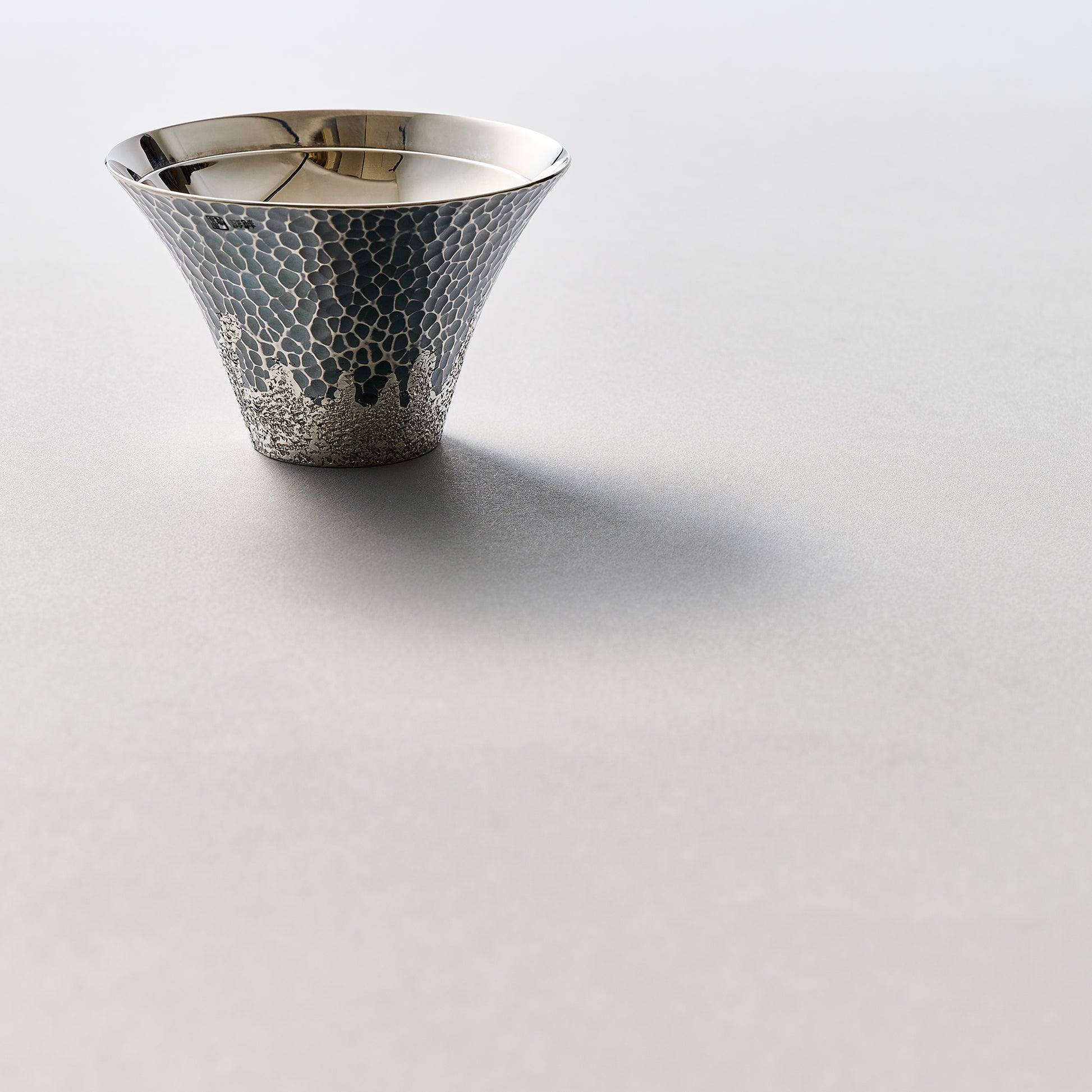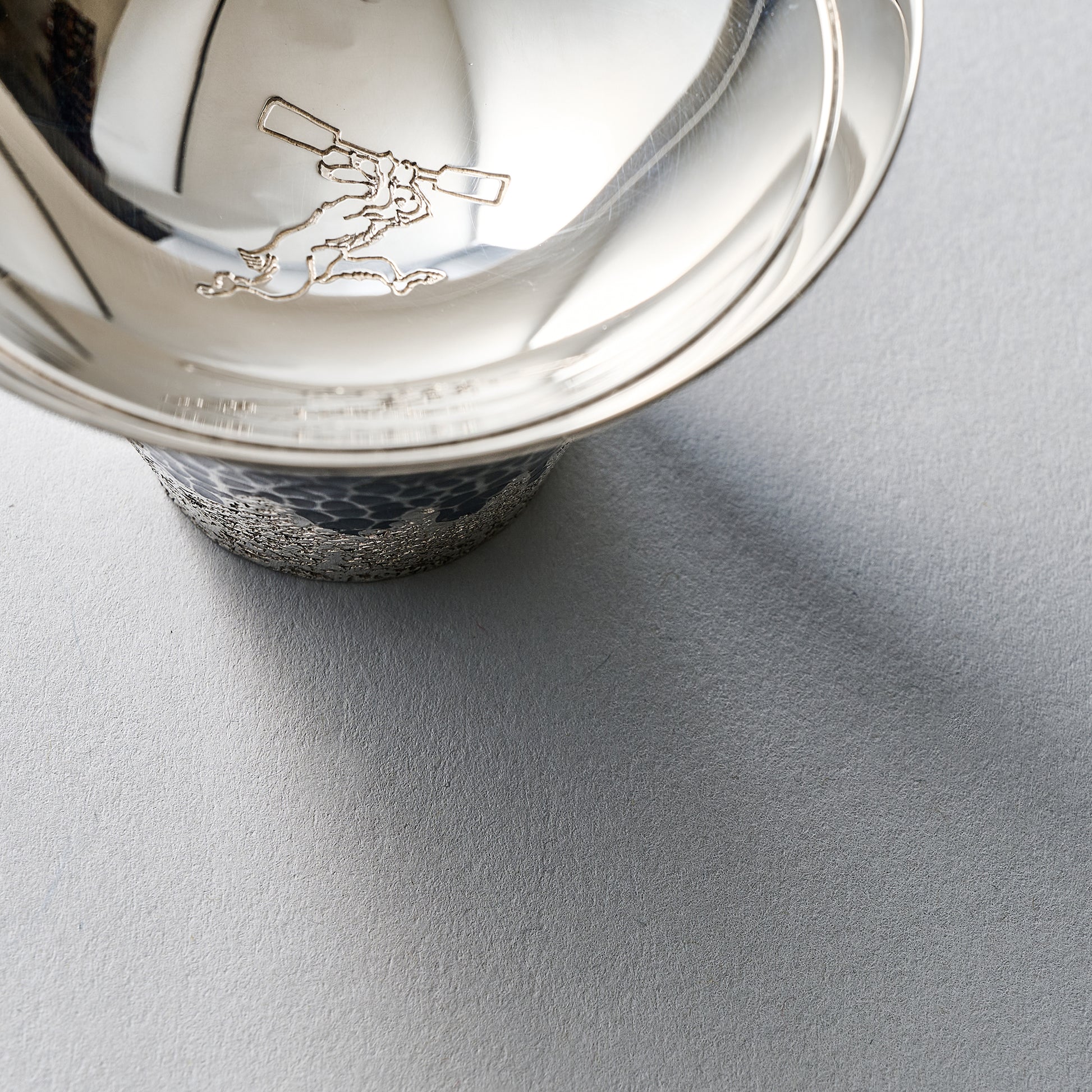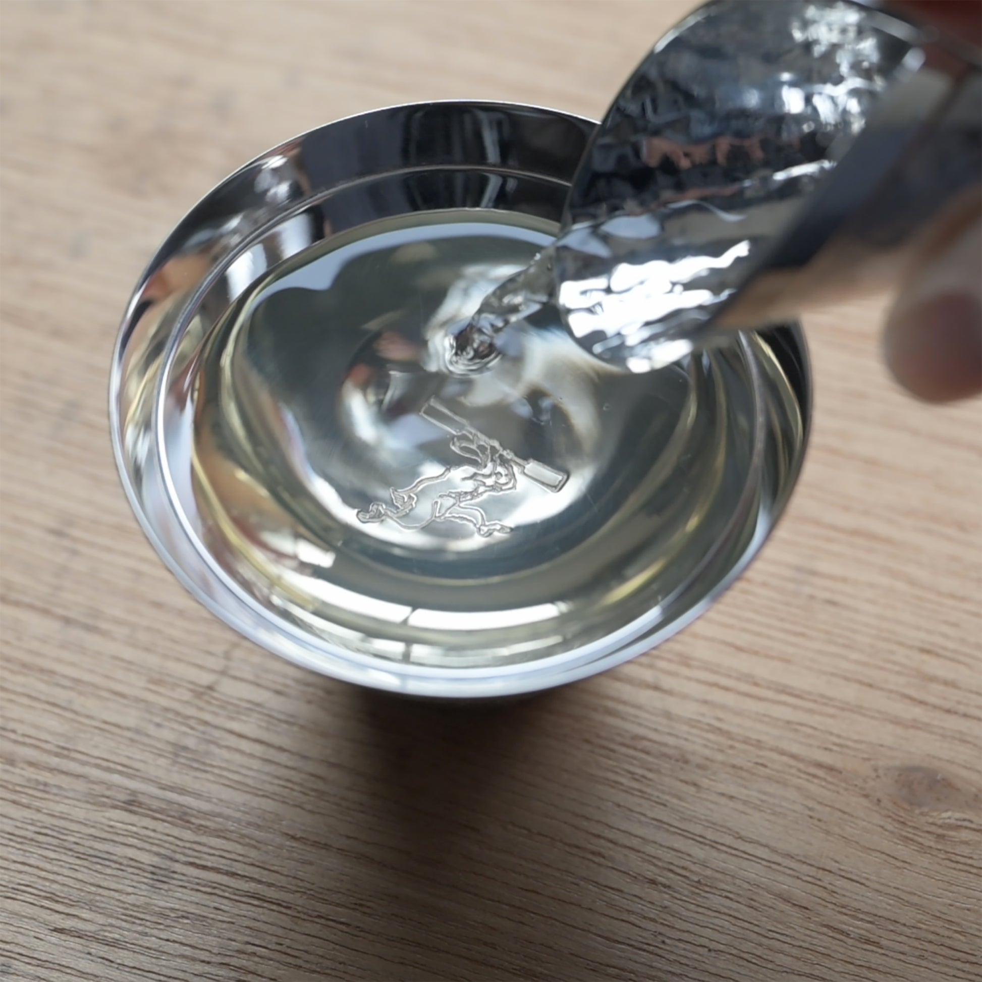 お酒を注ぐと白く輝く銀の盃に玉が浮かびあがり、玉を満月に見立てて満月の中にウサギが餅付きをしている図柄が浮き出ます。表面は薬品により黒く古色を付ける古美仕上げです。