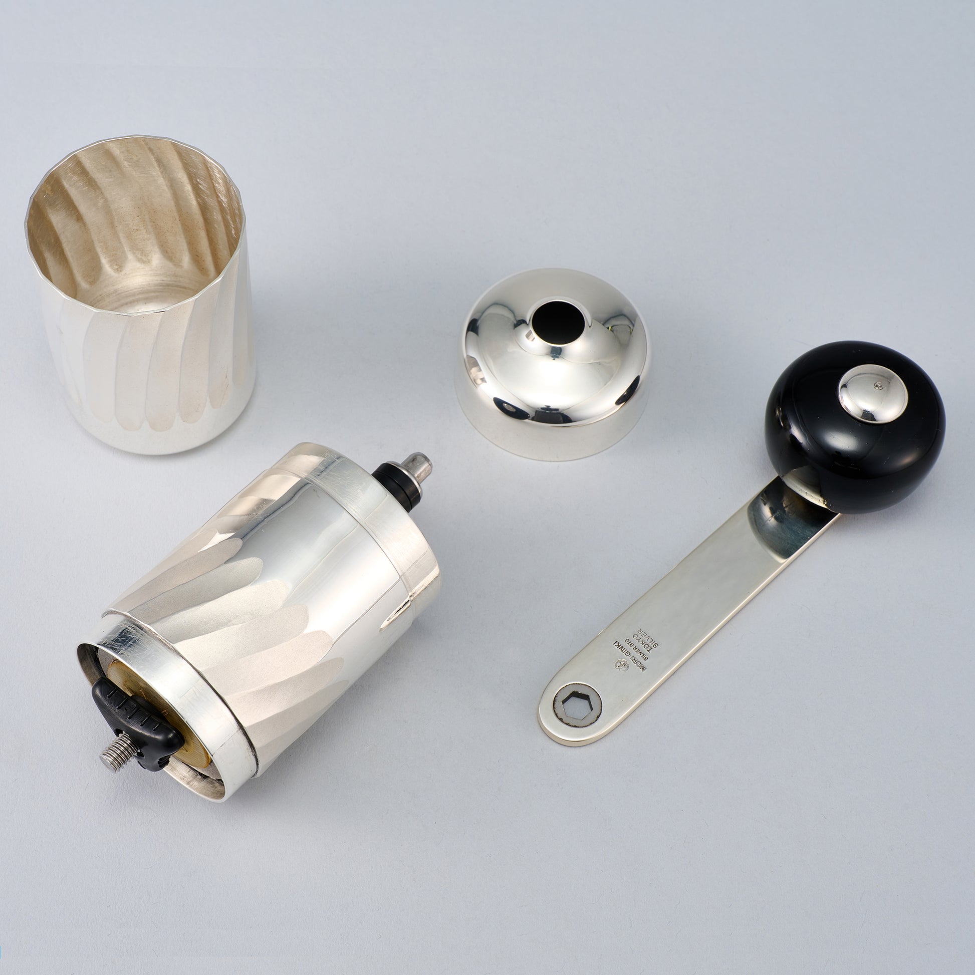 銀製のコーヒーミルです。円筒形状にひねり縦筋を施した美しいミルです。